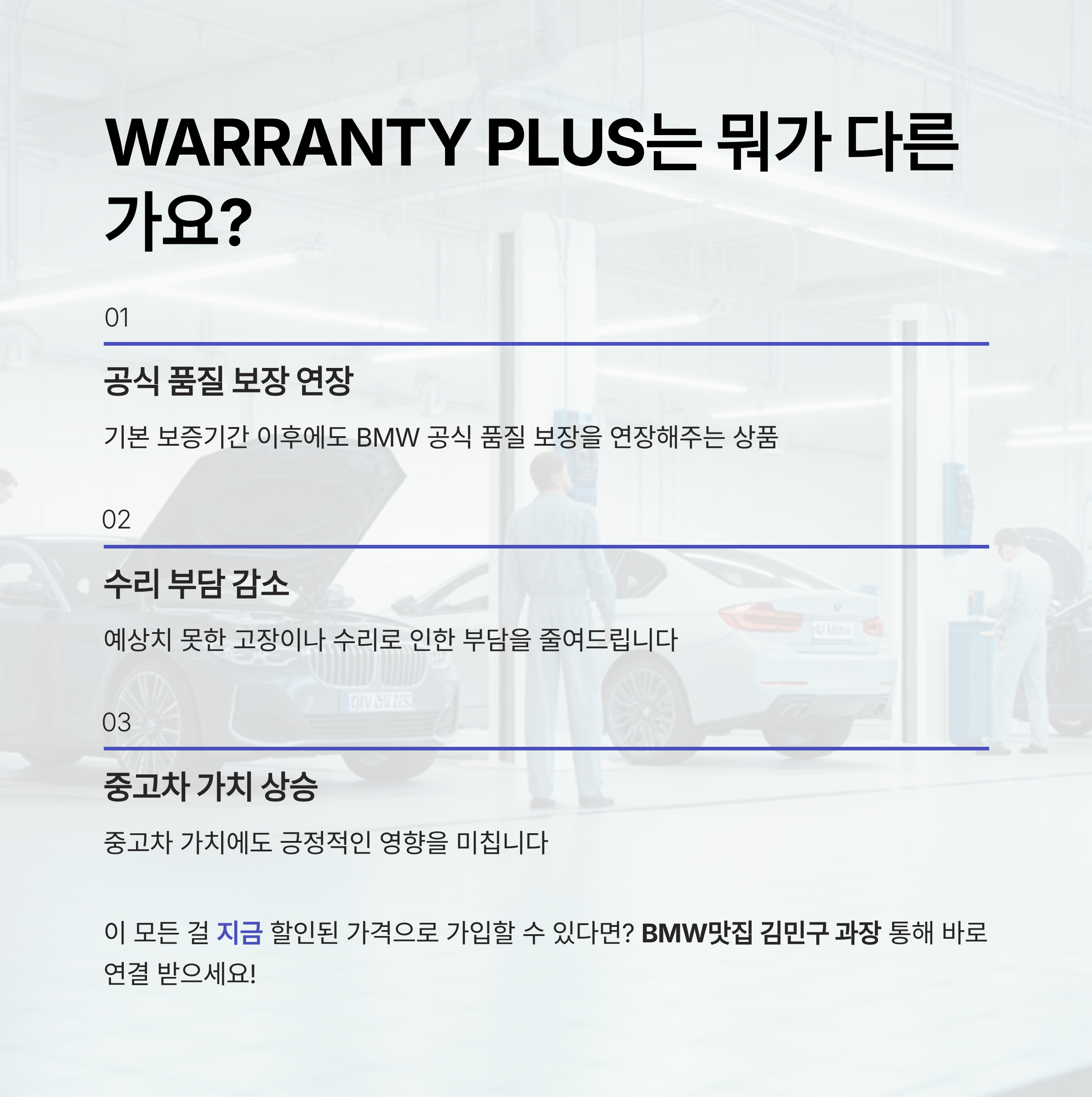 BMW 공식 품질 보장을 연장해주는 상품이 바로 WARRANTY PLUS입니다.