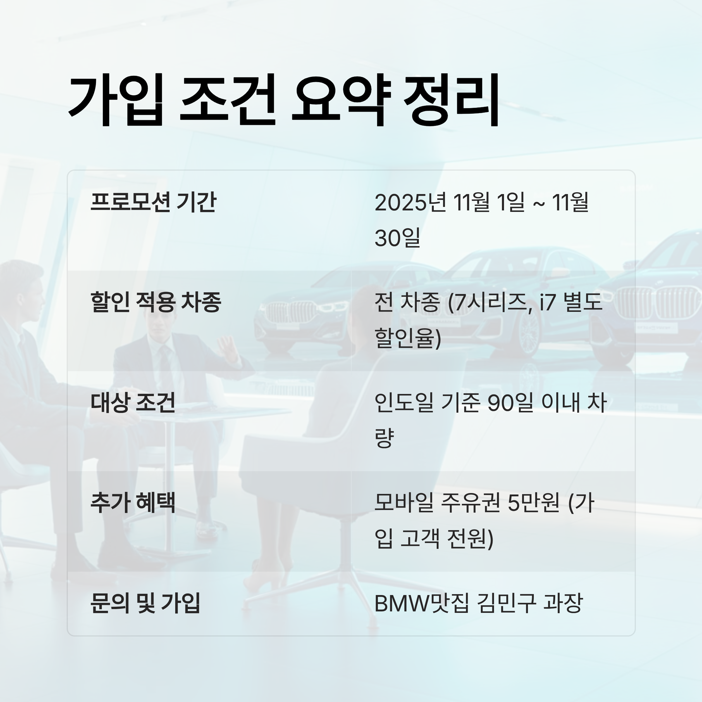 | 할인 적용 차종 | 전 차종 (7시리즈, i7 별도 할인율) | 인도일 기준 90일 이내 차량 |