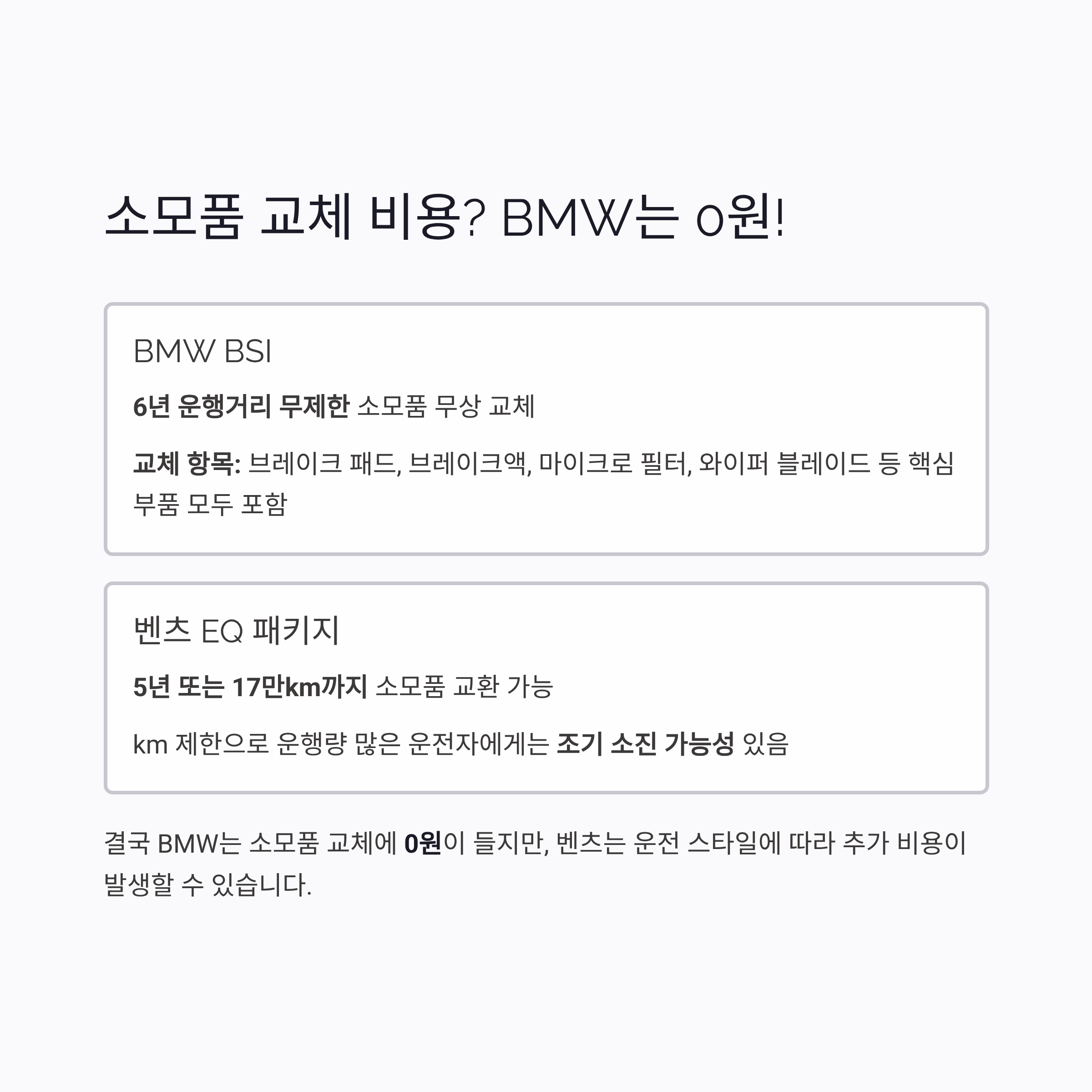 | 소모품 교환 기간 | 6년 / 무제한 (BSI) | 5년 / 17만km (EQ 패키지) |