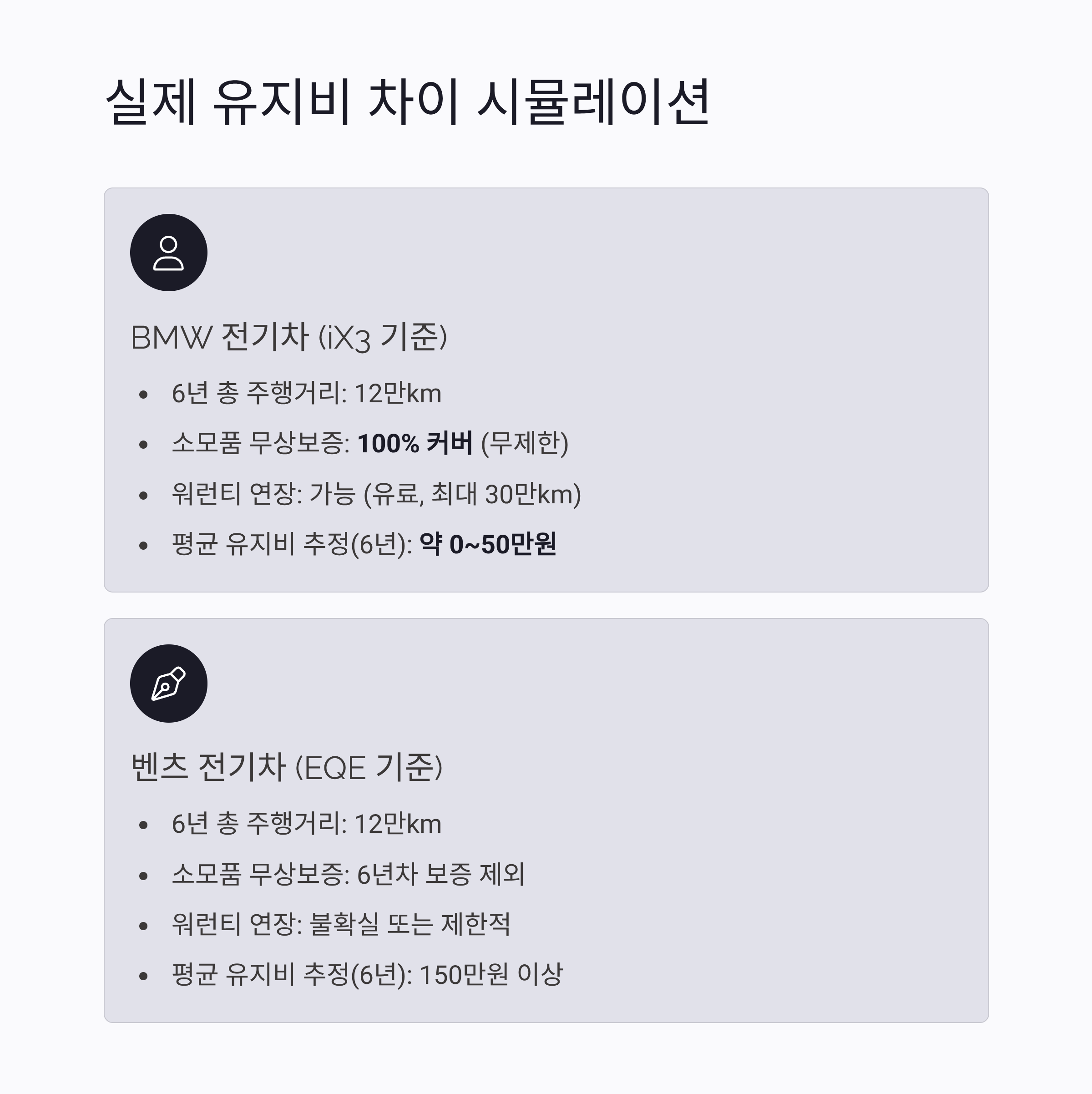 | 조건 | BMW 전기차 (iX3 기준) | 벤츠 전기차 (EQE 기준) |