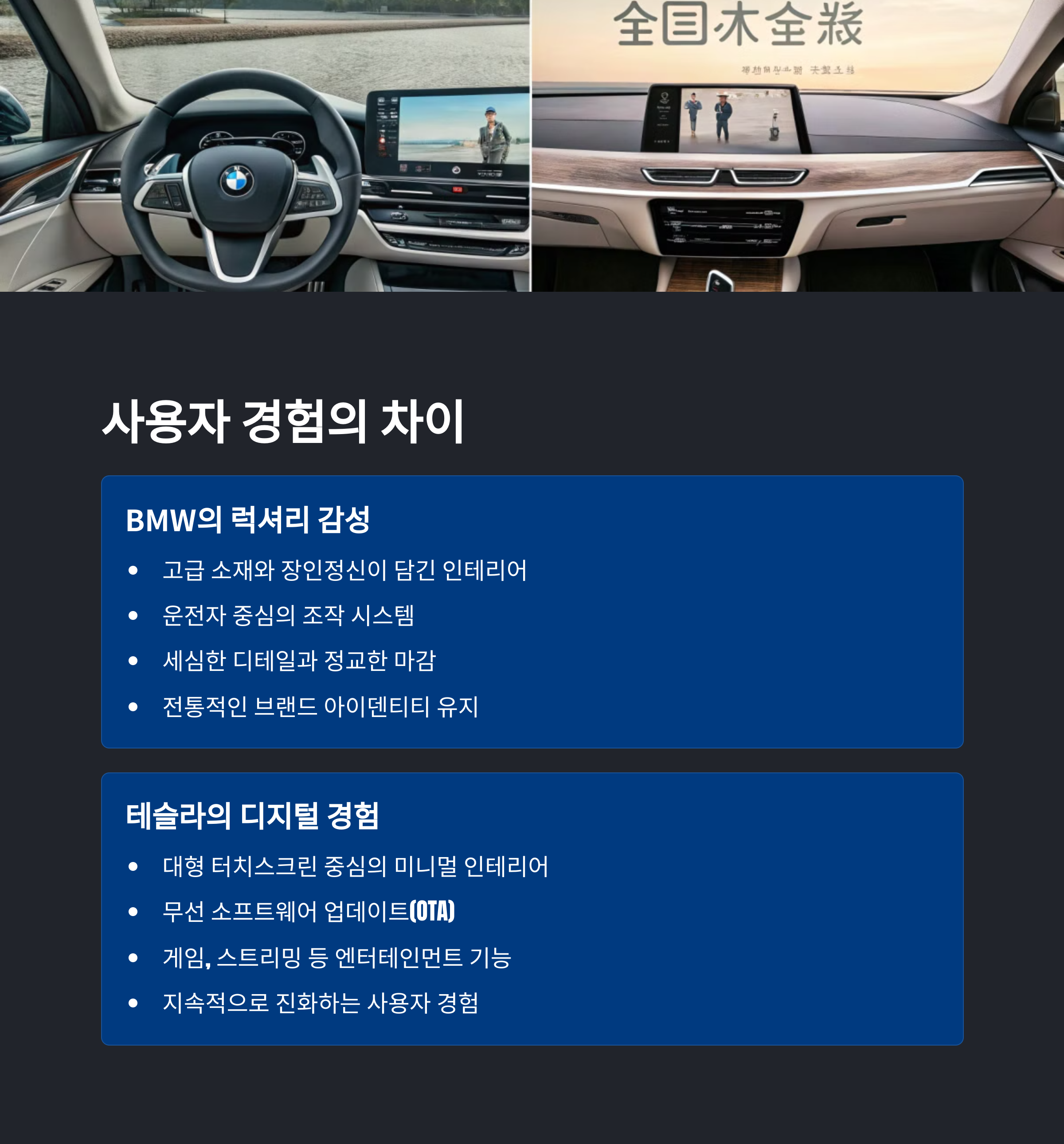 BMW가 전통적인 자동차 제조사의 강점을 지닌다면, 테슬라는 소프트웨어 중심의 테크 기업으로서 전기차를 바라보는 시각이 전혀 다릅니다.