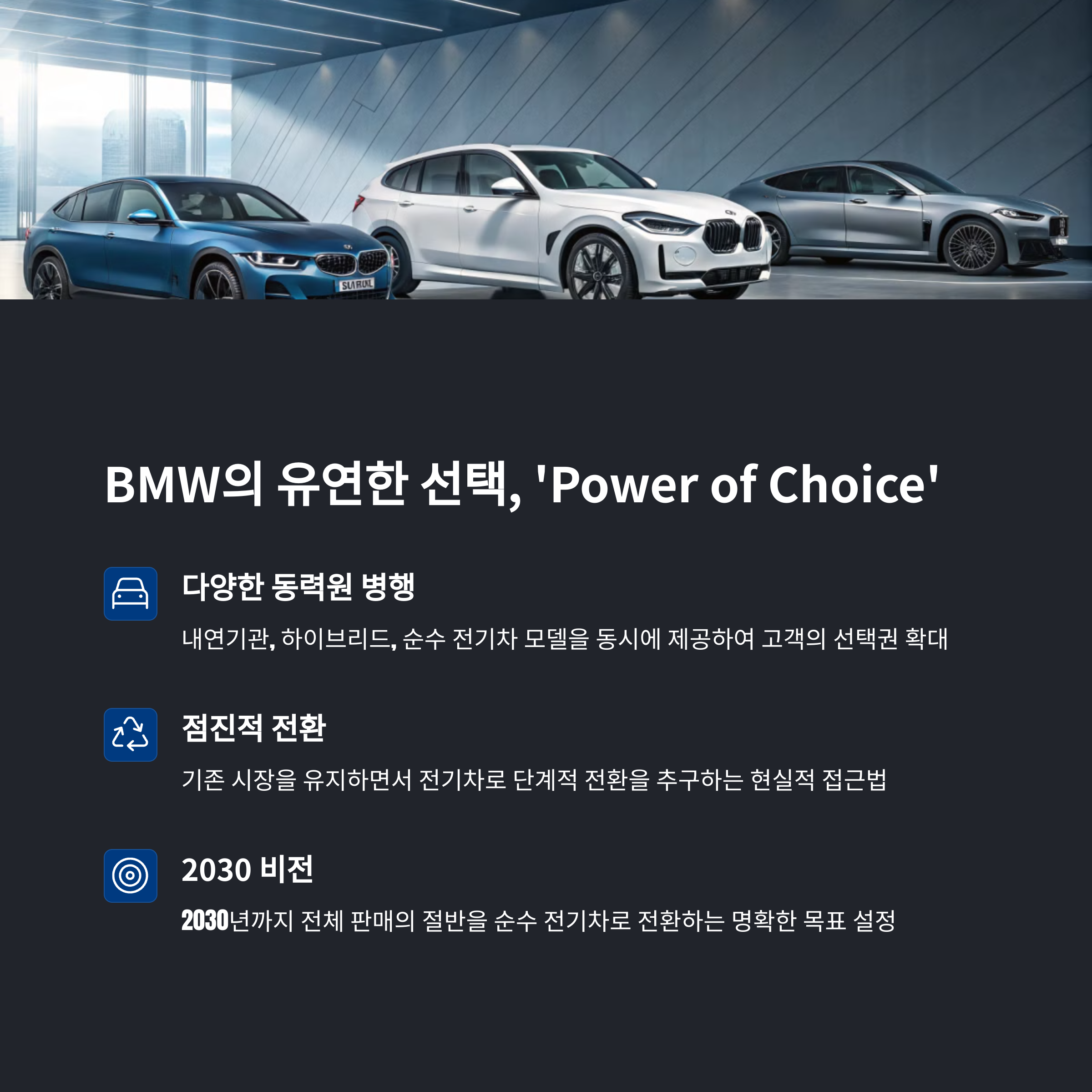 BMW는 전기차 전환에 있어 'Power of Choice' 전략을 핵심으로 내세웁니다.