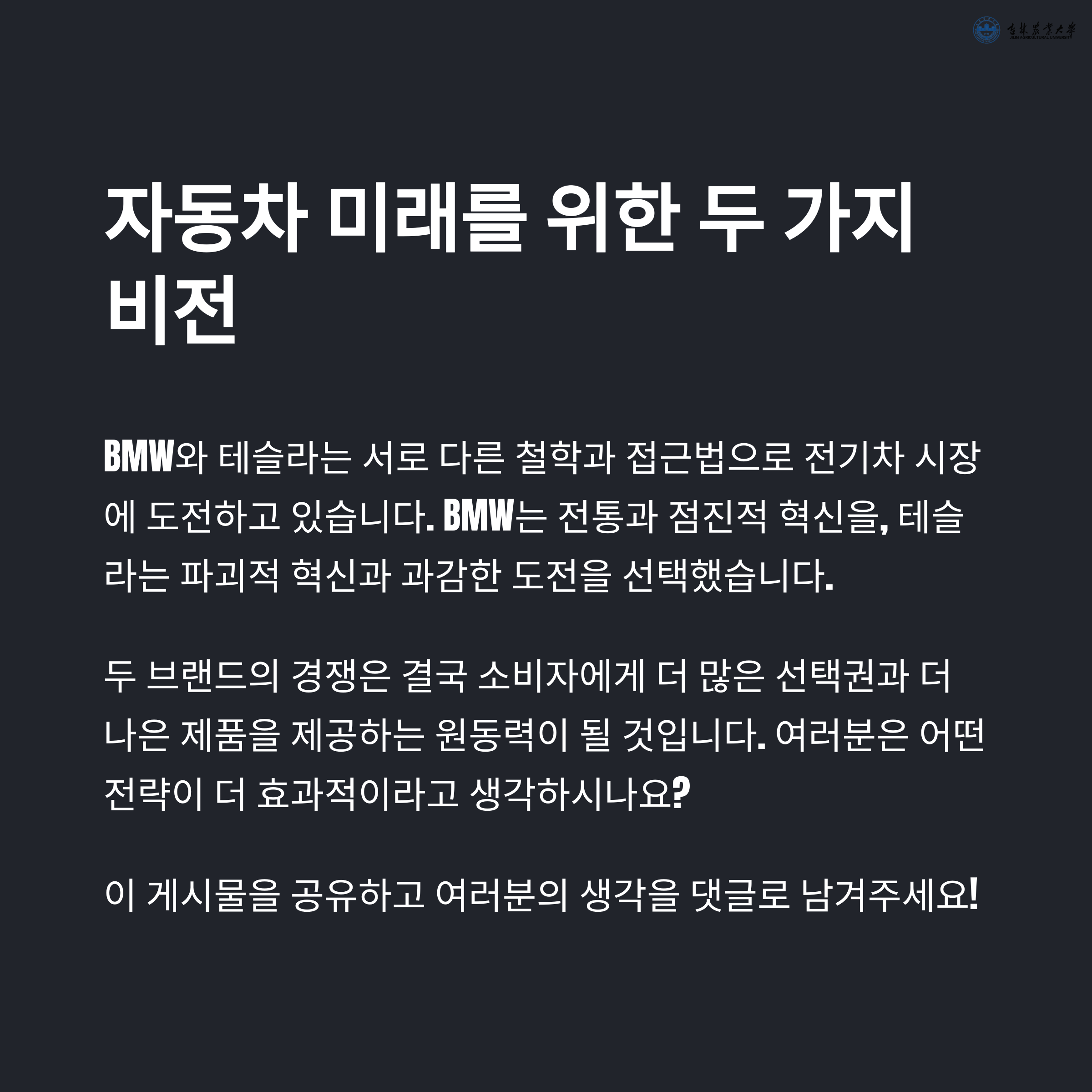 결국 전기차 시대에서 BMW와 테슬라의 경쟁은 단순한 차량 비교가 아니라, 기술과 브랜드 철학, 소비자 경험에 대한 치열한 가치 경쟁이 되고 있습니다.