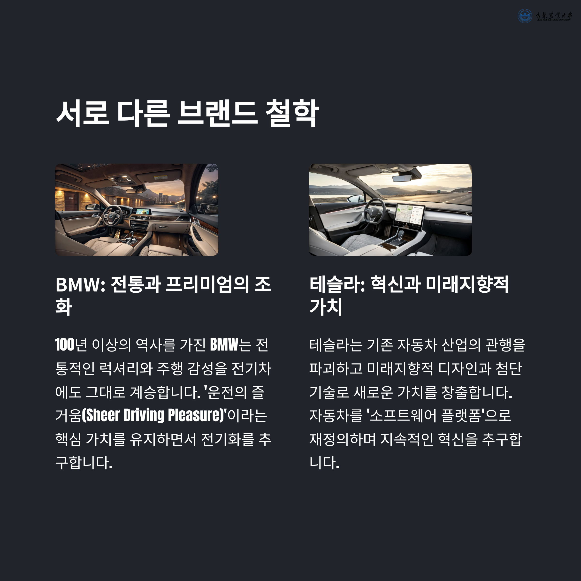 BMW가 전통적인 자동차 제조사의 강점을 지닌다면, 테슬라는 소프트웨어 중심의 테크 기업으로서 전기차를 바라보는 시각이 전혀 다릅니다.
