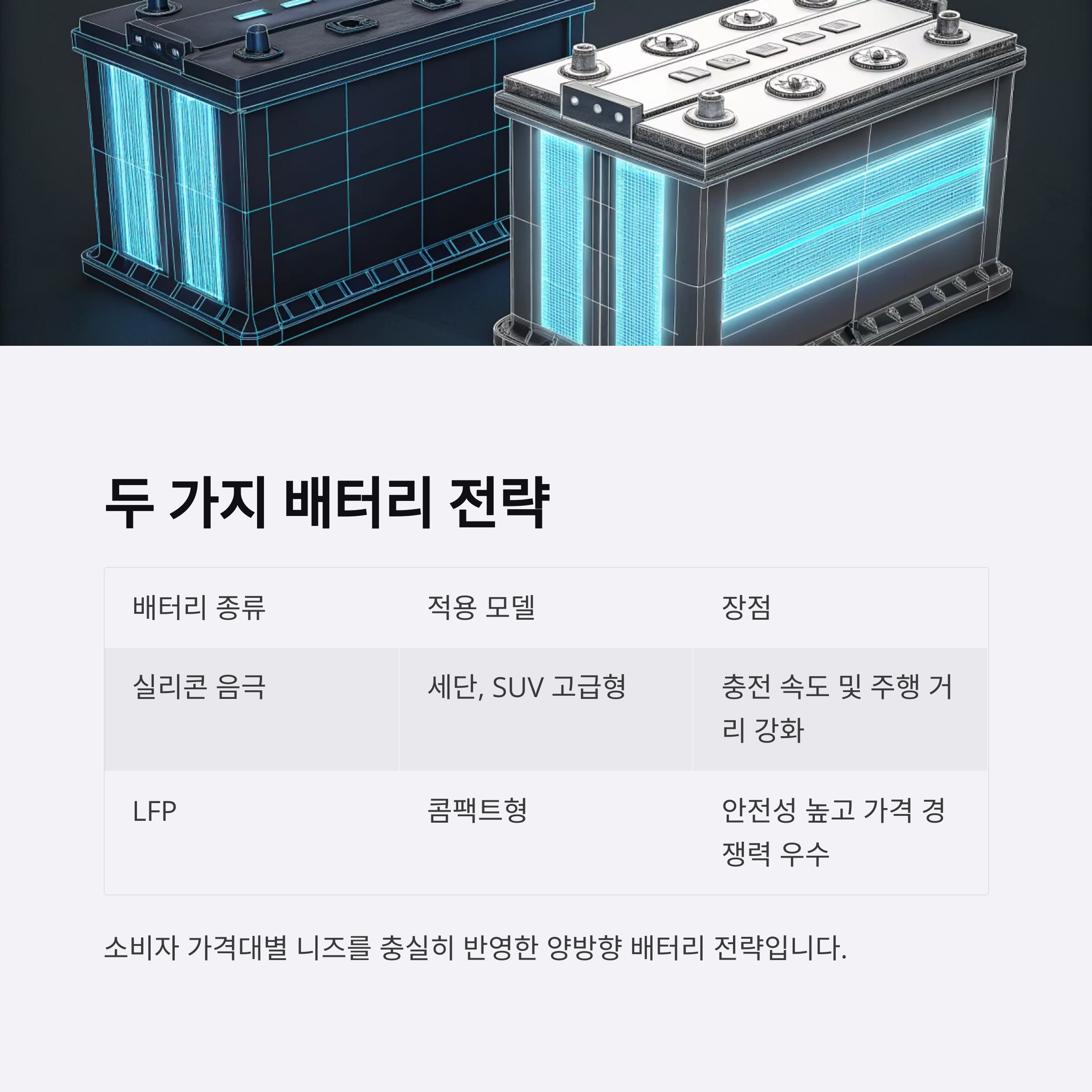 고성능 모델에는 실리콘 음극 기반 배터리를, 보급형에는 LFP(리튬인산철)를 적용합니다.