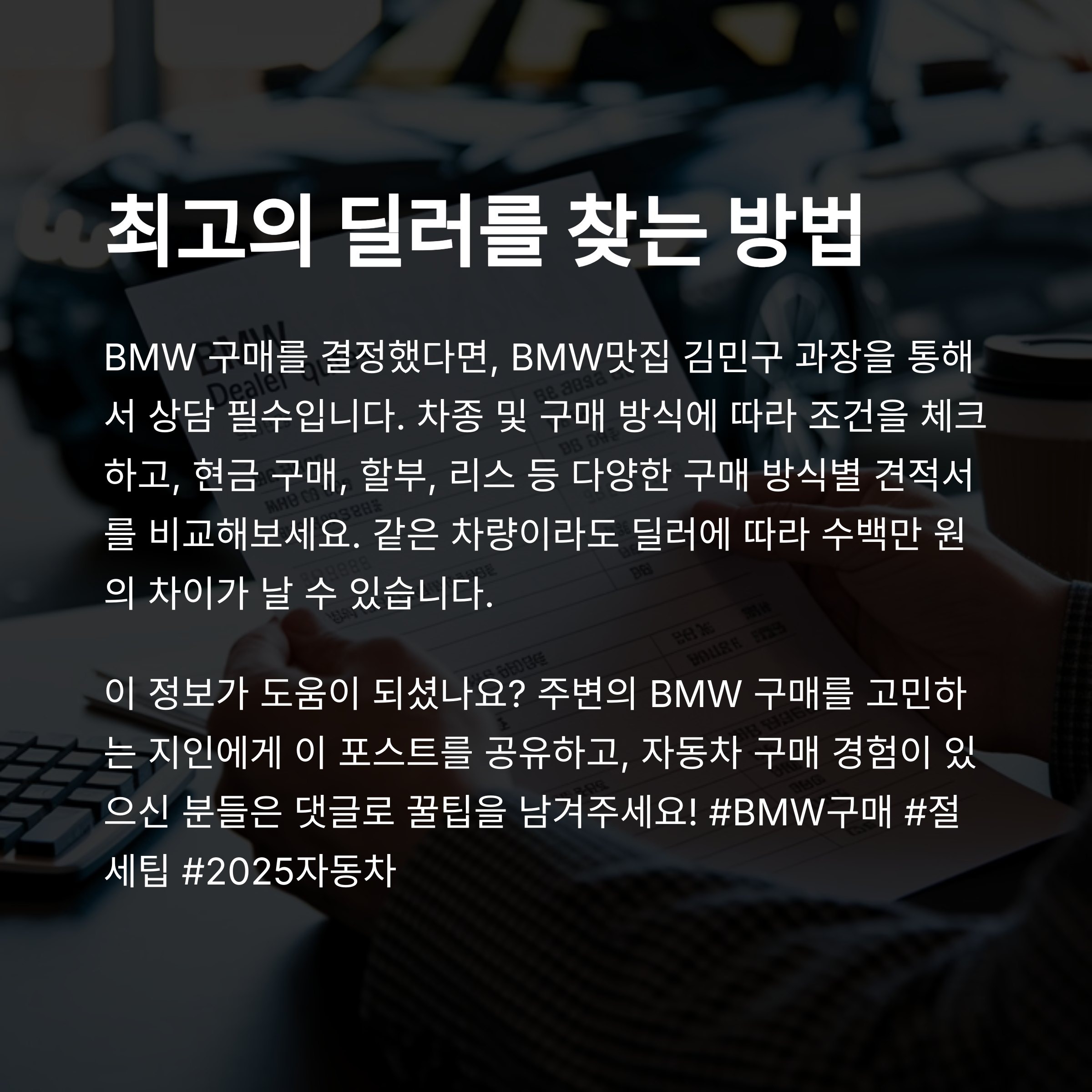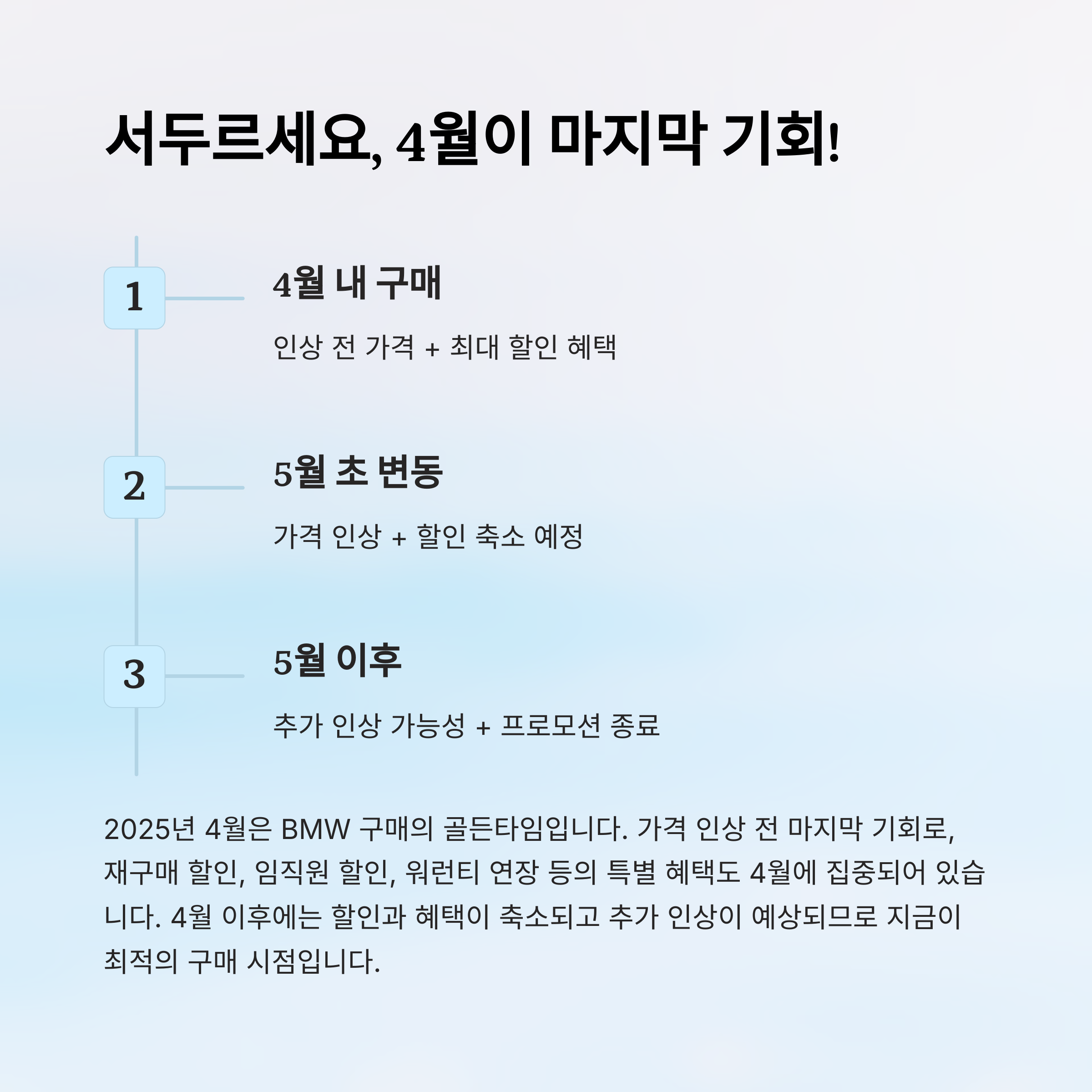 BMW 가격이 지속적으로 인상될 가능성이 큽니다. 할인을 포함한 절세 구매 시점은 바로 지금입니다. 장기렌트/리스의 절세도 큰 장점으로 작용합니다. 딜러 비교와 구매 조건을 철저히 확인하세요. 2025년 4월의 프로모션 종료 전에 구매 권장.