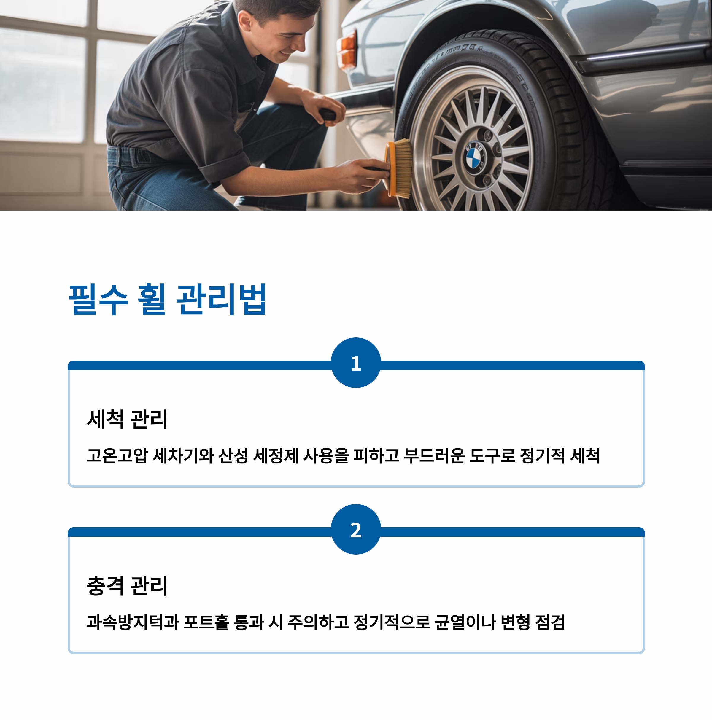 정품휠이든 사제휠이든 관리의 핵심은 휠 세척과 충격 관리입니다.