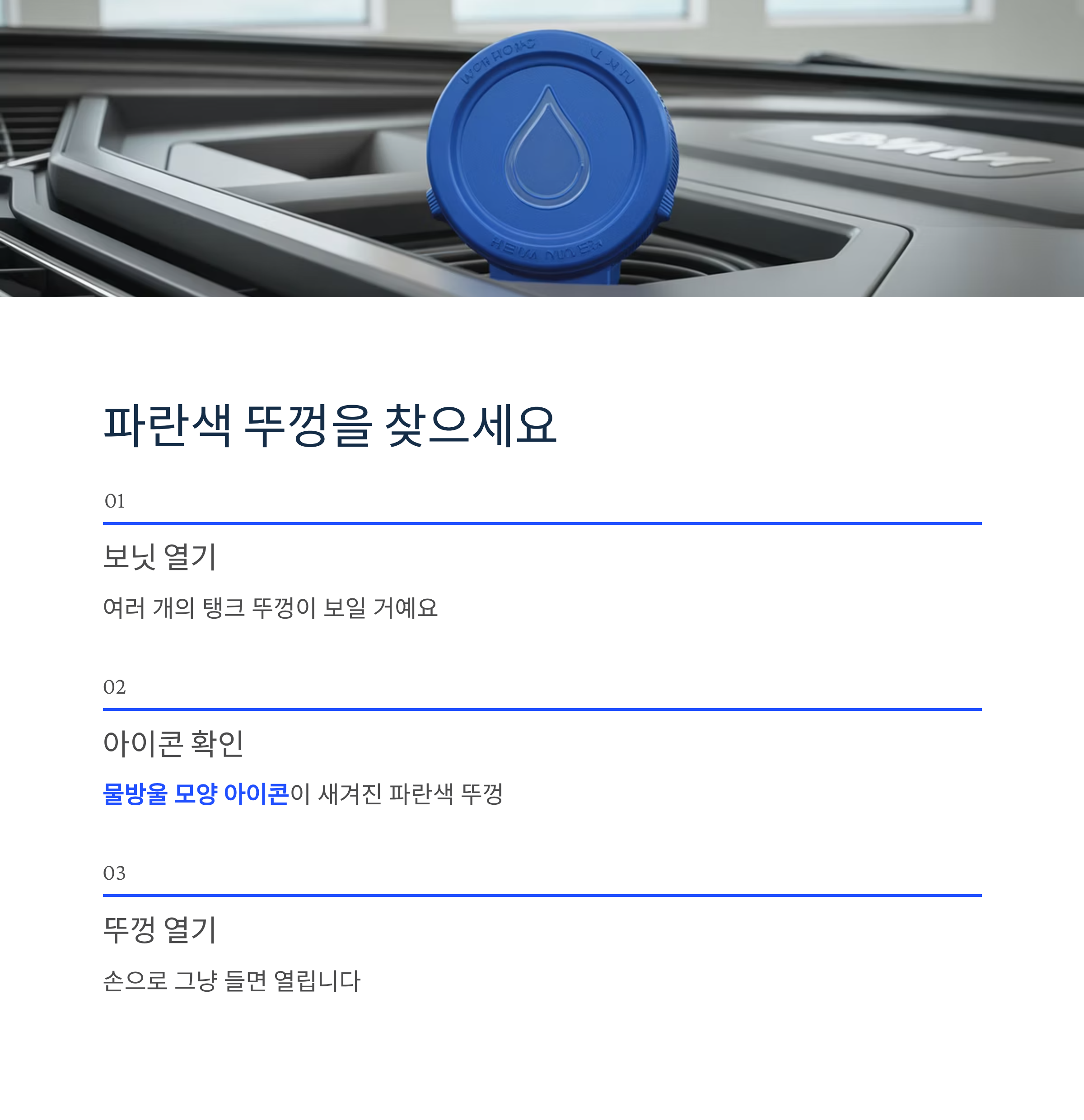 보닛을 열면 여러 개의 탱크 뚜껑이 보여 헷갈릴 수 있어요.