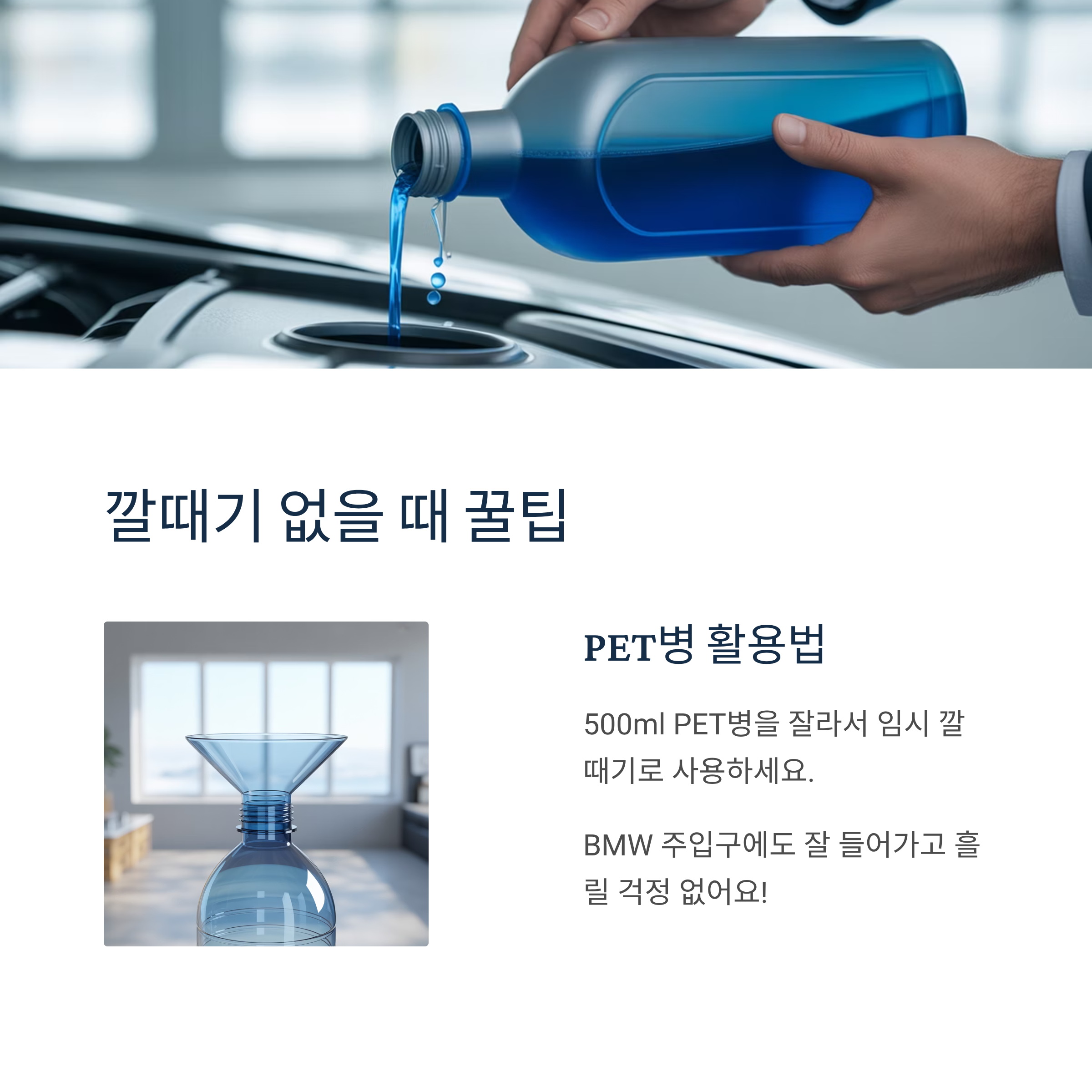 깔때기가 없으면, 500ml PET병을 잘라서 임시 깔때기로 활용할 수 있어요.