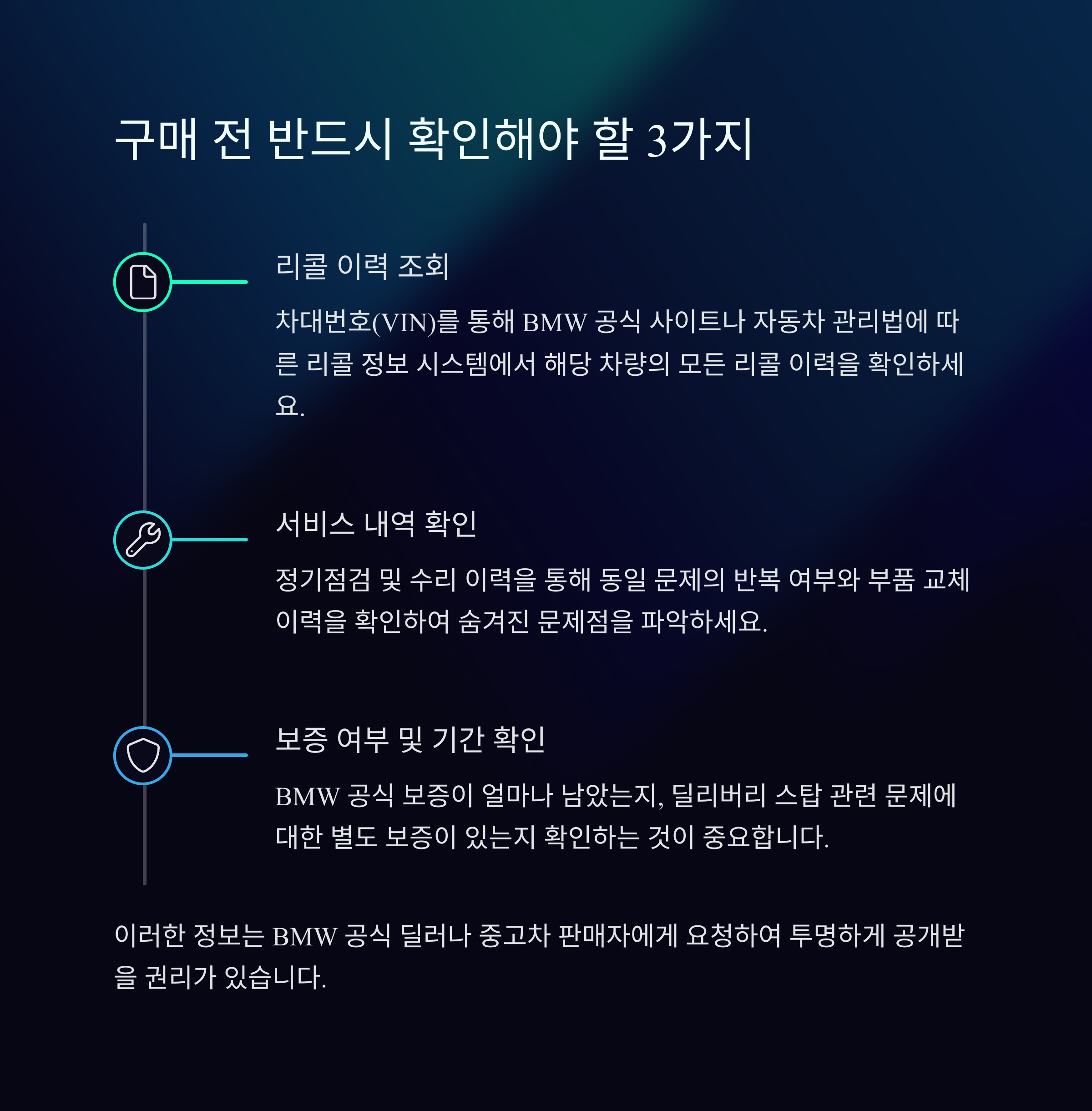 BMW 중고차 구매 전, 딜리버리 스탑 여부를 포함한 차량 이력을 확인하기 위해 아래 항목을 반드시 체크해야 합니다.