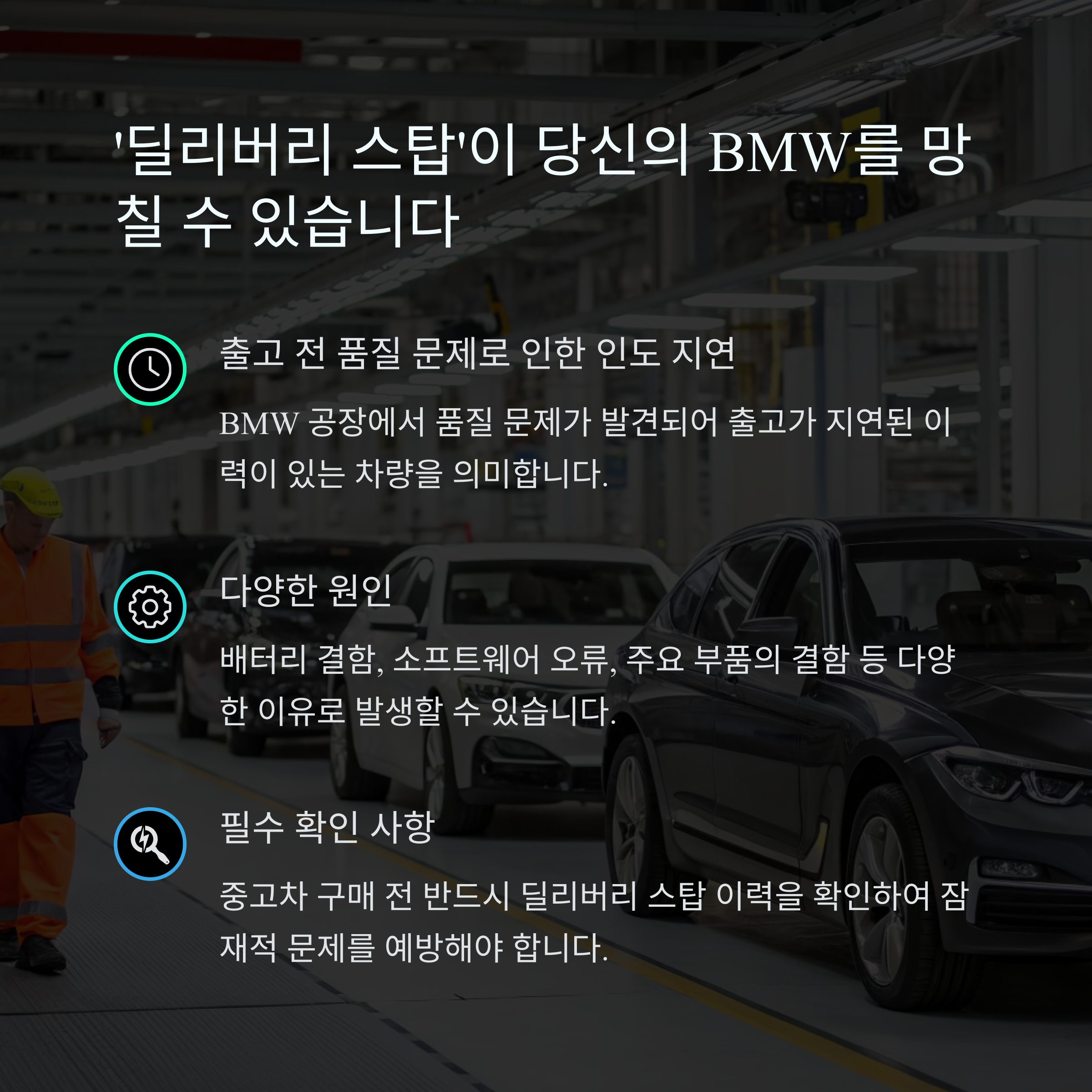BMW 중고차 구매 시 주의해야 할 딜리버리 스탑 이력을 제대로 이해하고, 검증된 차량을 선택하는 것이 현명한 소비로 이어질 것입니다.