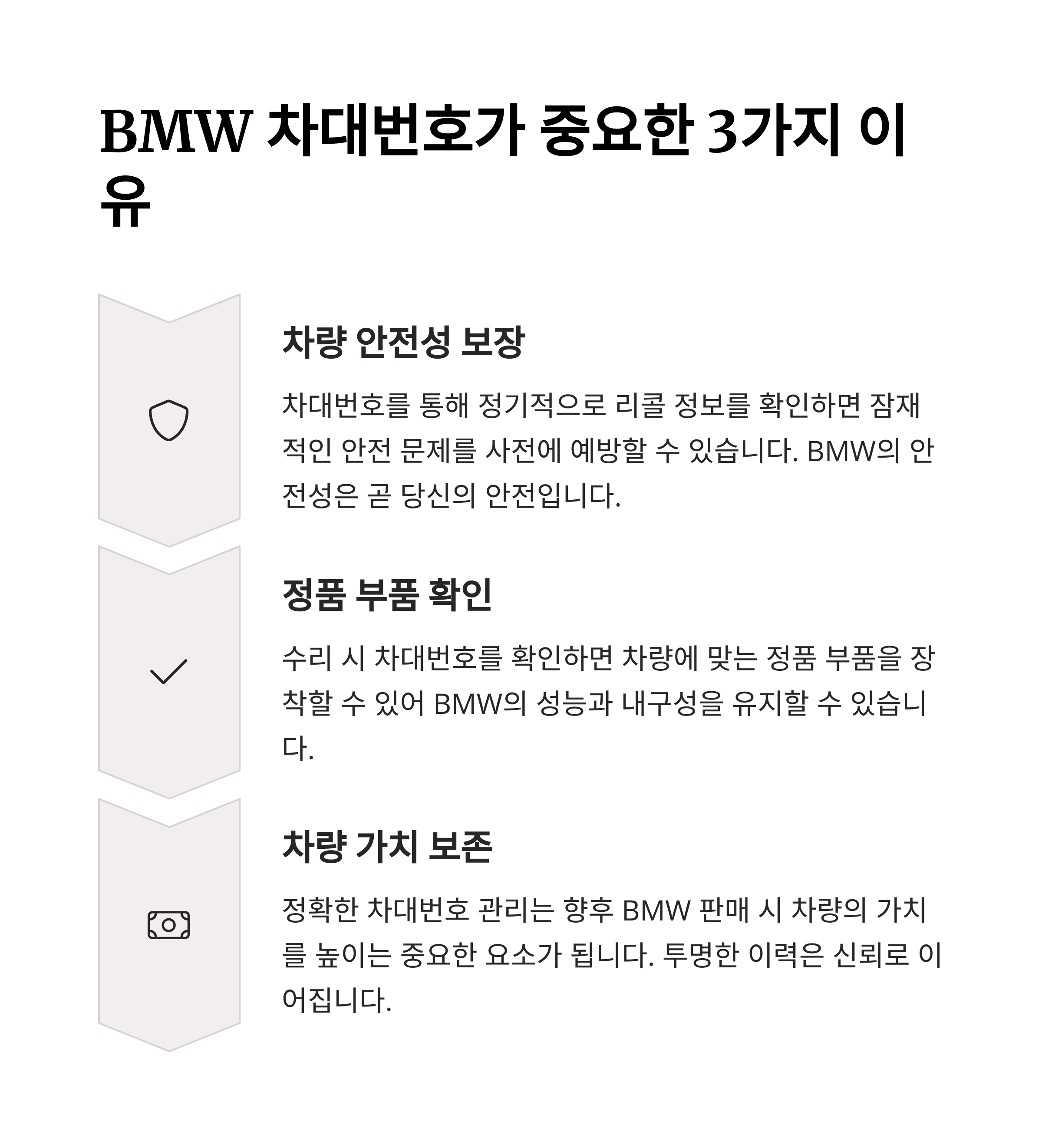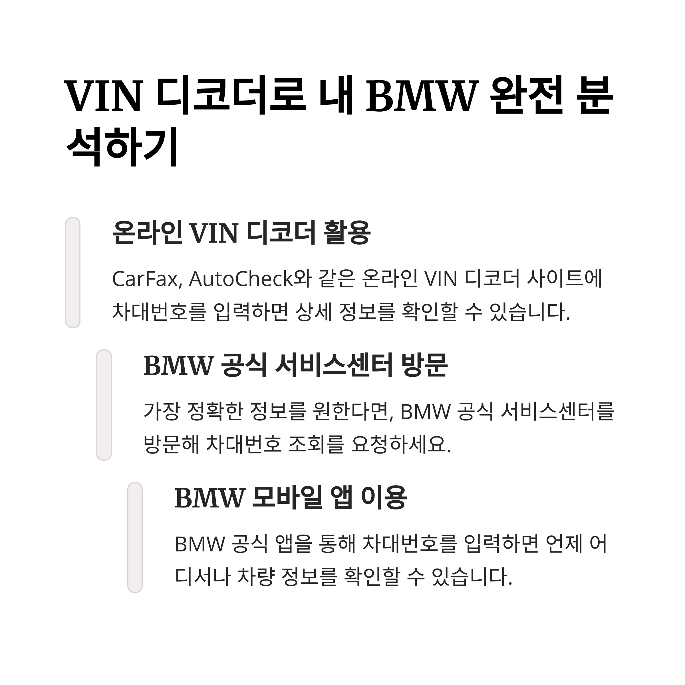 이처럼 BMW 차량을 구매한 뒤에도 VIN을 활용하면 차량을 보다 안전하고 체계적으로 관리할 수 있으며, 장기적인 차량 가치 보존에도 도움이 됩니다.