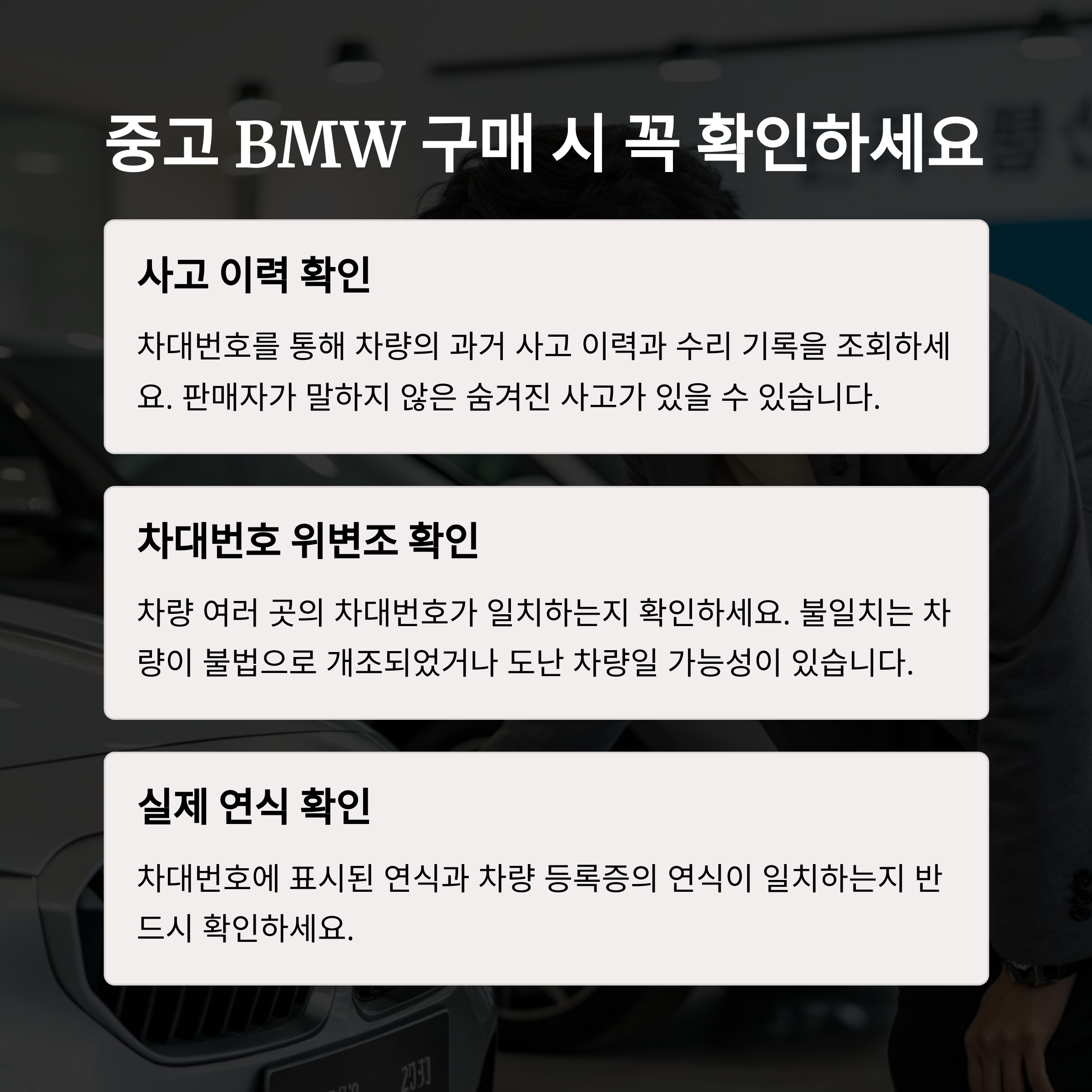 BMW처럼 프리미엄 차량은 범죄 이용 가능성이 높기 때문에, 반드시 차대번호 위조 여부를 꼼꼼히 확인해야 합니다.
