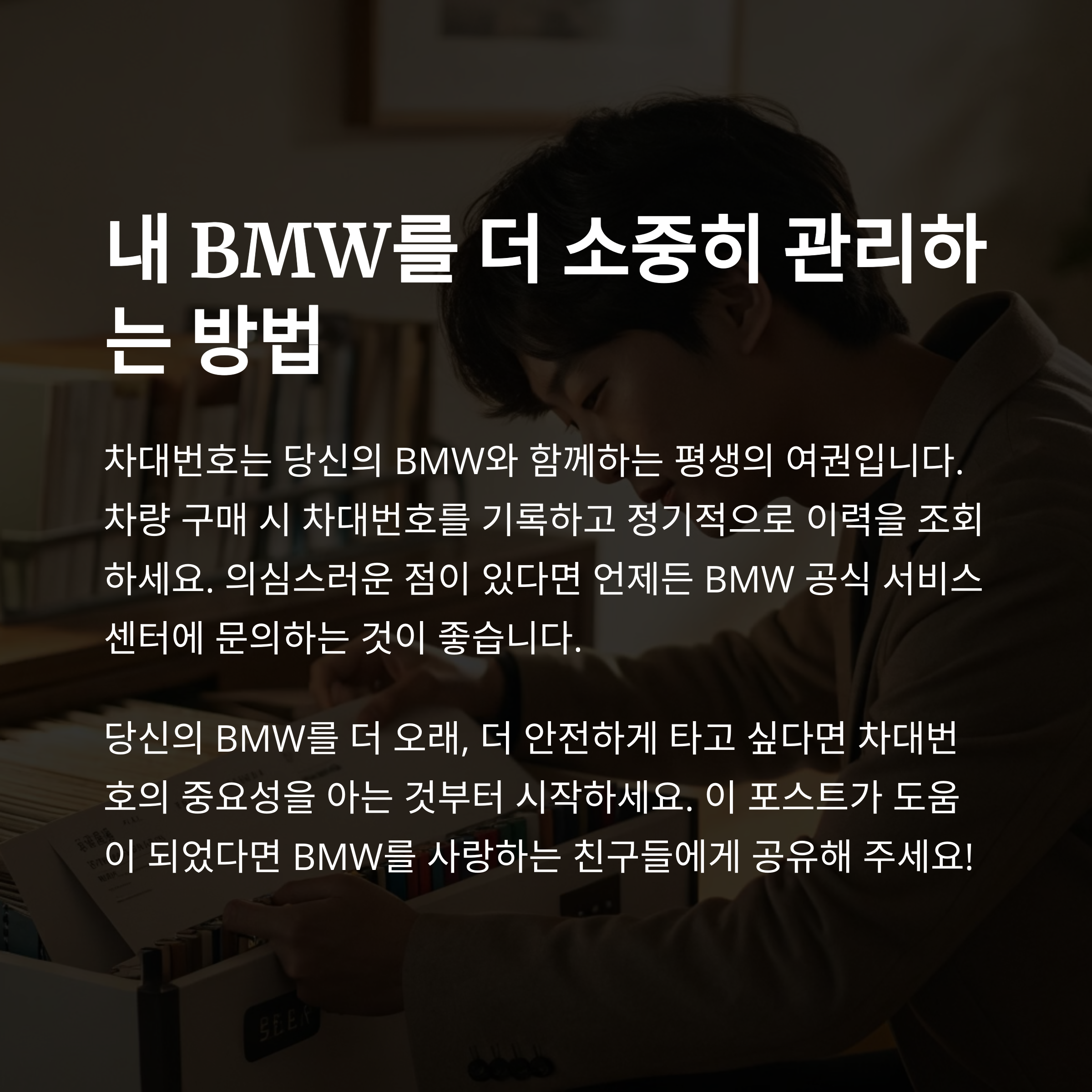 이처럼 BMW 차량을 구매한 뒤에도 VIN을 활용하면 차량을 보다 안전하고 체계적으로 관리할 수 있으며, 장기적인 차량 가치 보존에도 도움이 됩니다.
