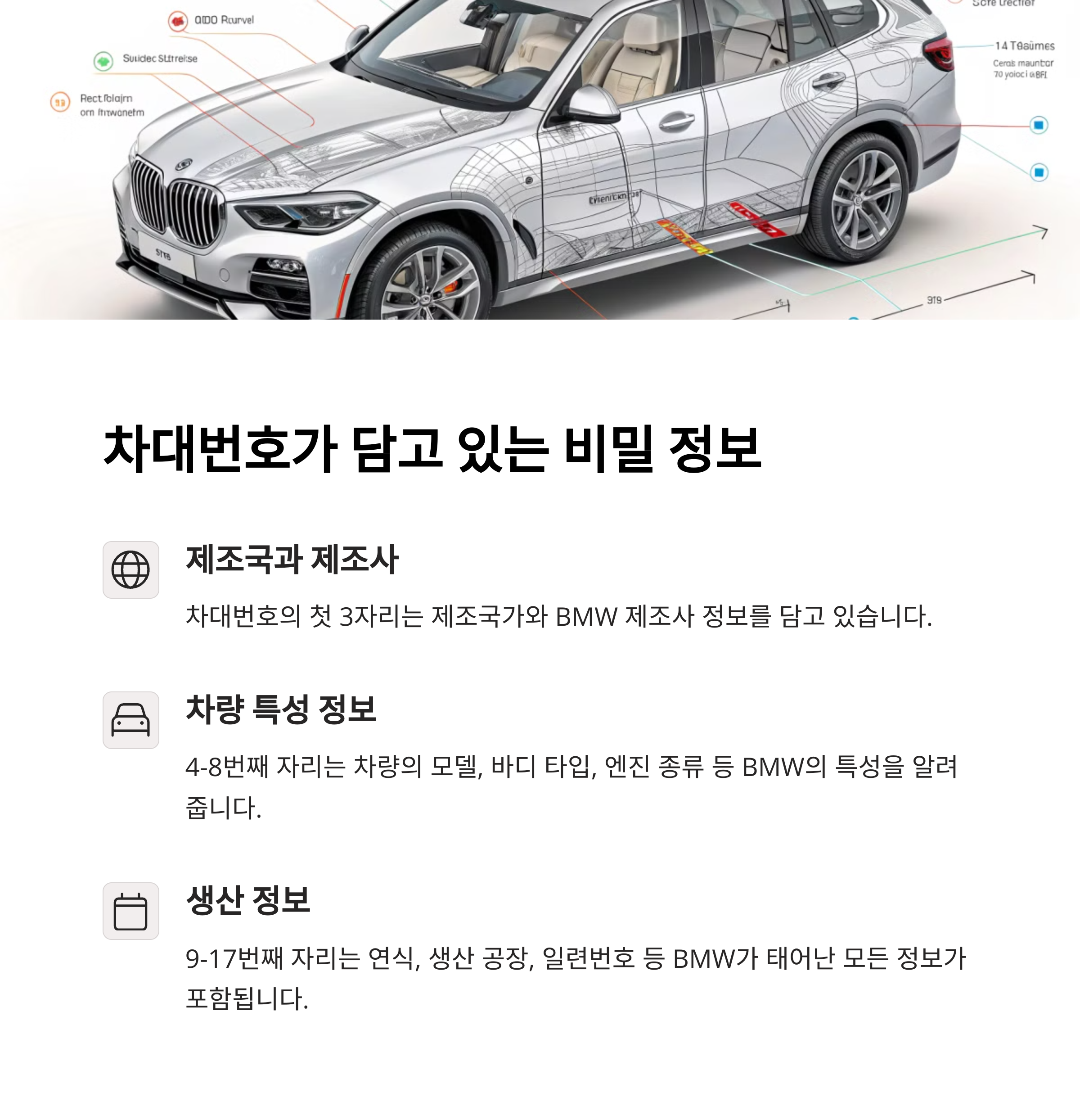 BMW의 VIN을 통해 확인 가능한 정보는 단순히 제조 연도나 모델명뿐만이 아닙니다. 아래와 같은 다양한 정보가 포함되어 있습니다.
