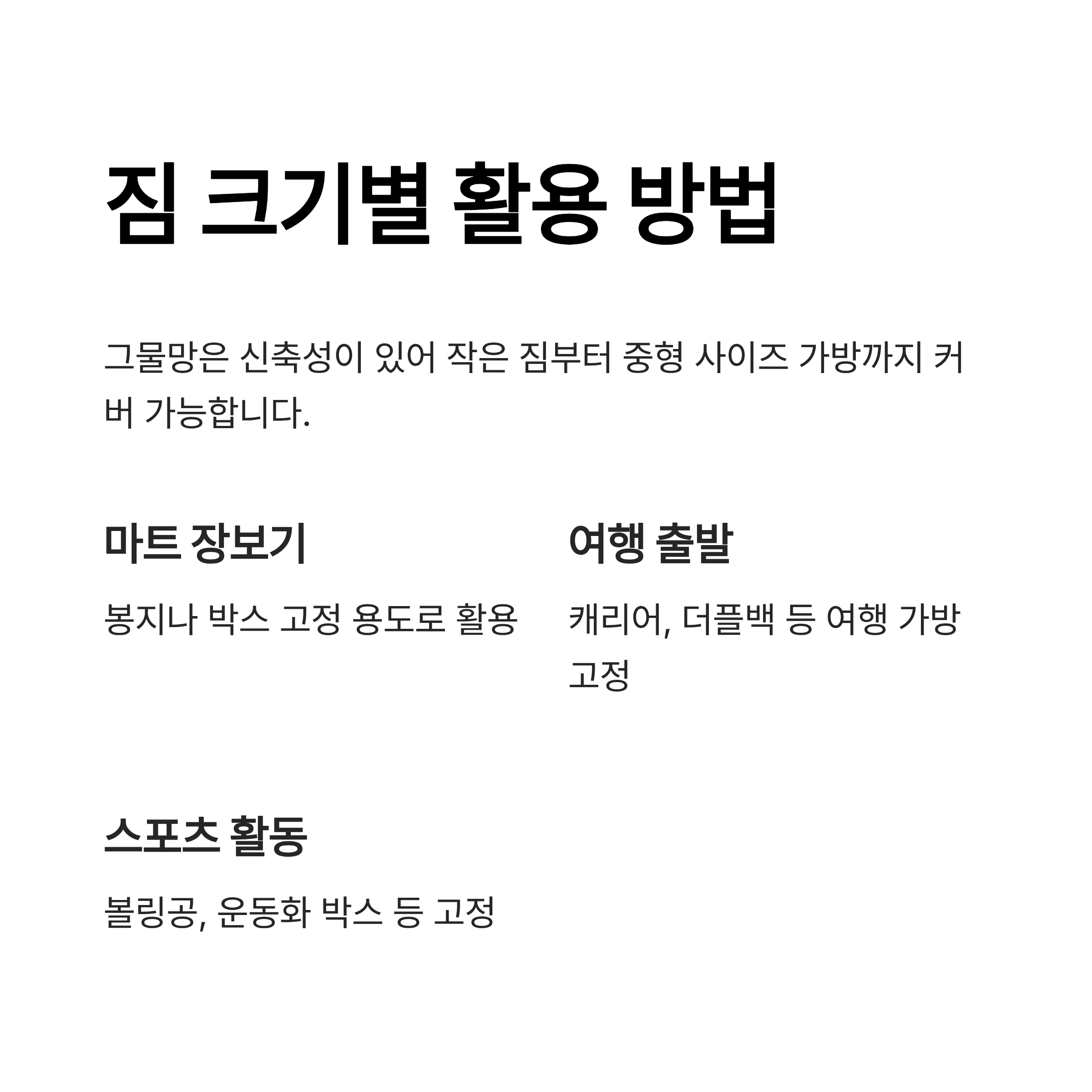 - 그물망 중앙에 짐을 올린 후, 손으로 살짝 당겨서 텐션을 주면 끝