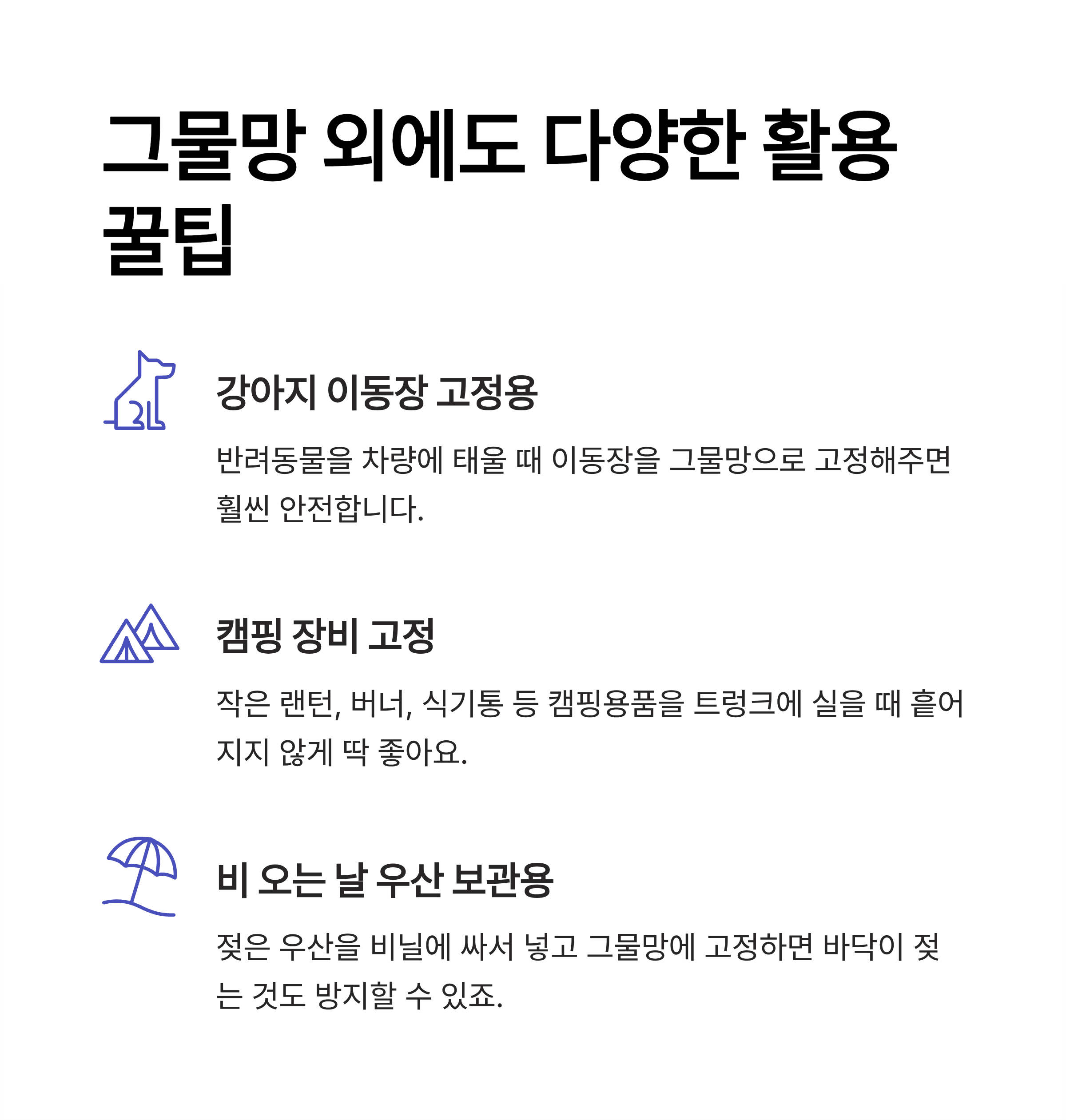반려동물을 차량에 태울 때 이동장을 그물망으로 고정해주면 훨씬 안전합니다. - 캠핑 장비 고정