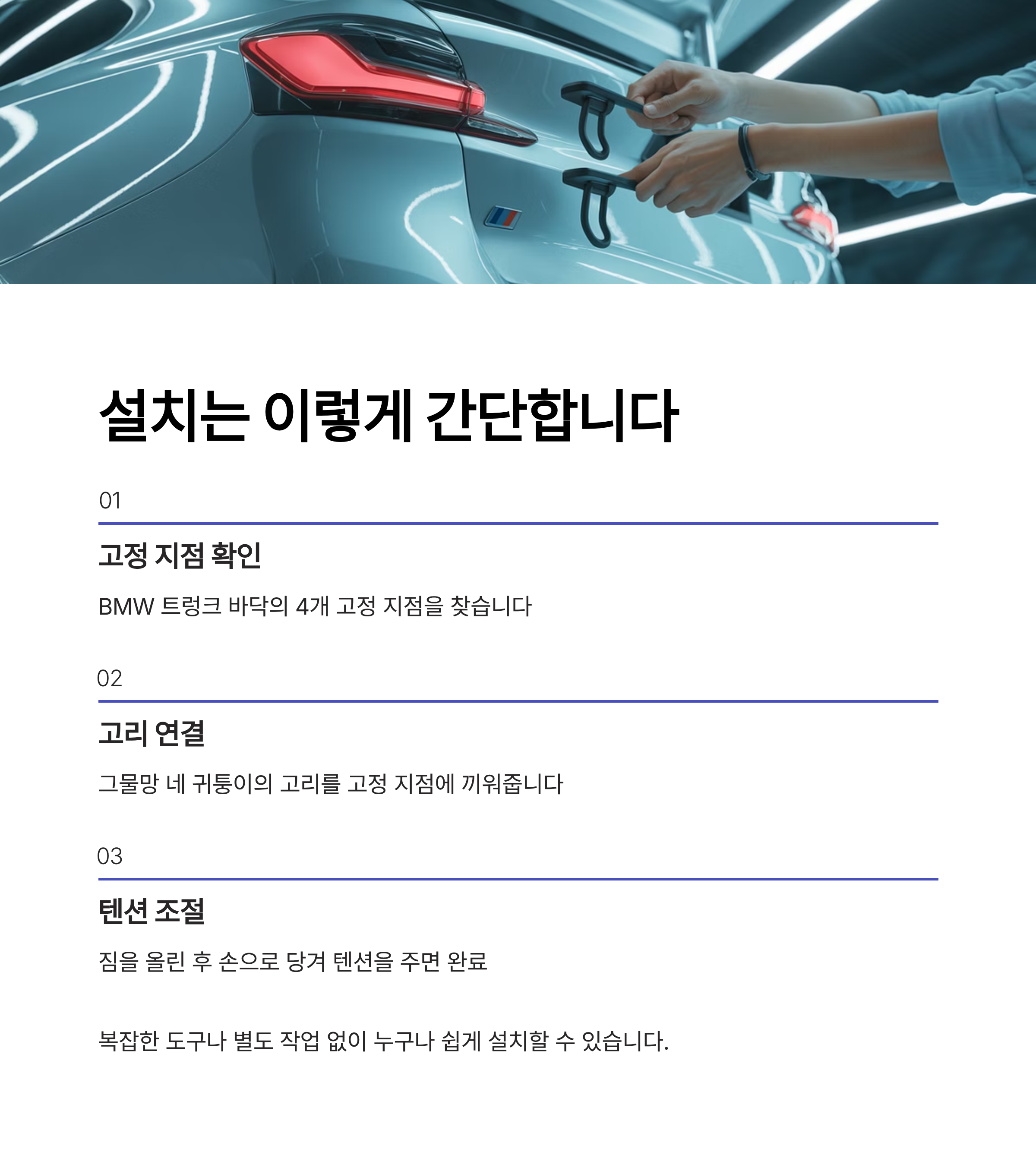 BMW에서 제공하는 정품 트렁크 그물망은 차량에 맞춘 정확한 사이즈와 고정 방식이 특징입니다.