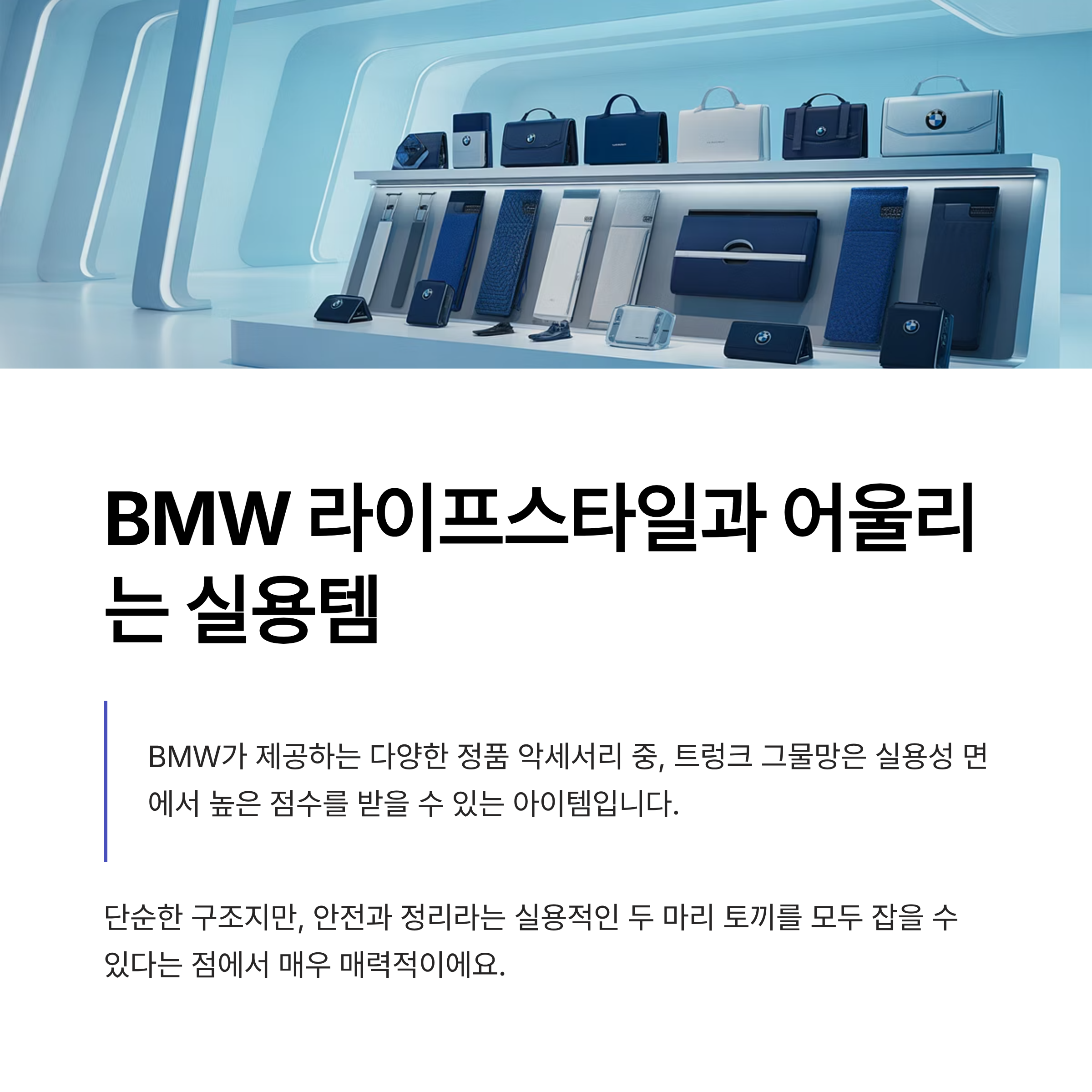 BMW가 제공하는 다양한 정품 악세서리 중, 트렁크 그물망은 실용성 면에서 높은 점수를 받을 수 있는 아이템입니다.
