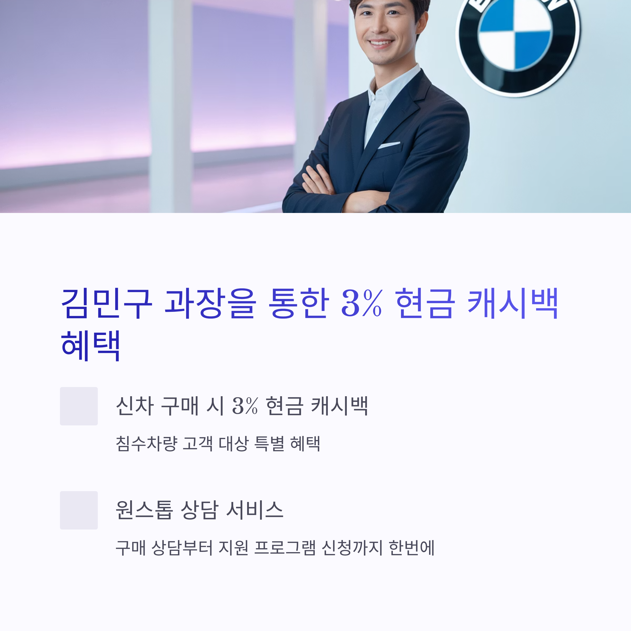 | 김민구 과장 구매 고객 | 신차 구매 시 3% 현금 캐시백 |