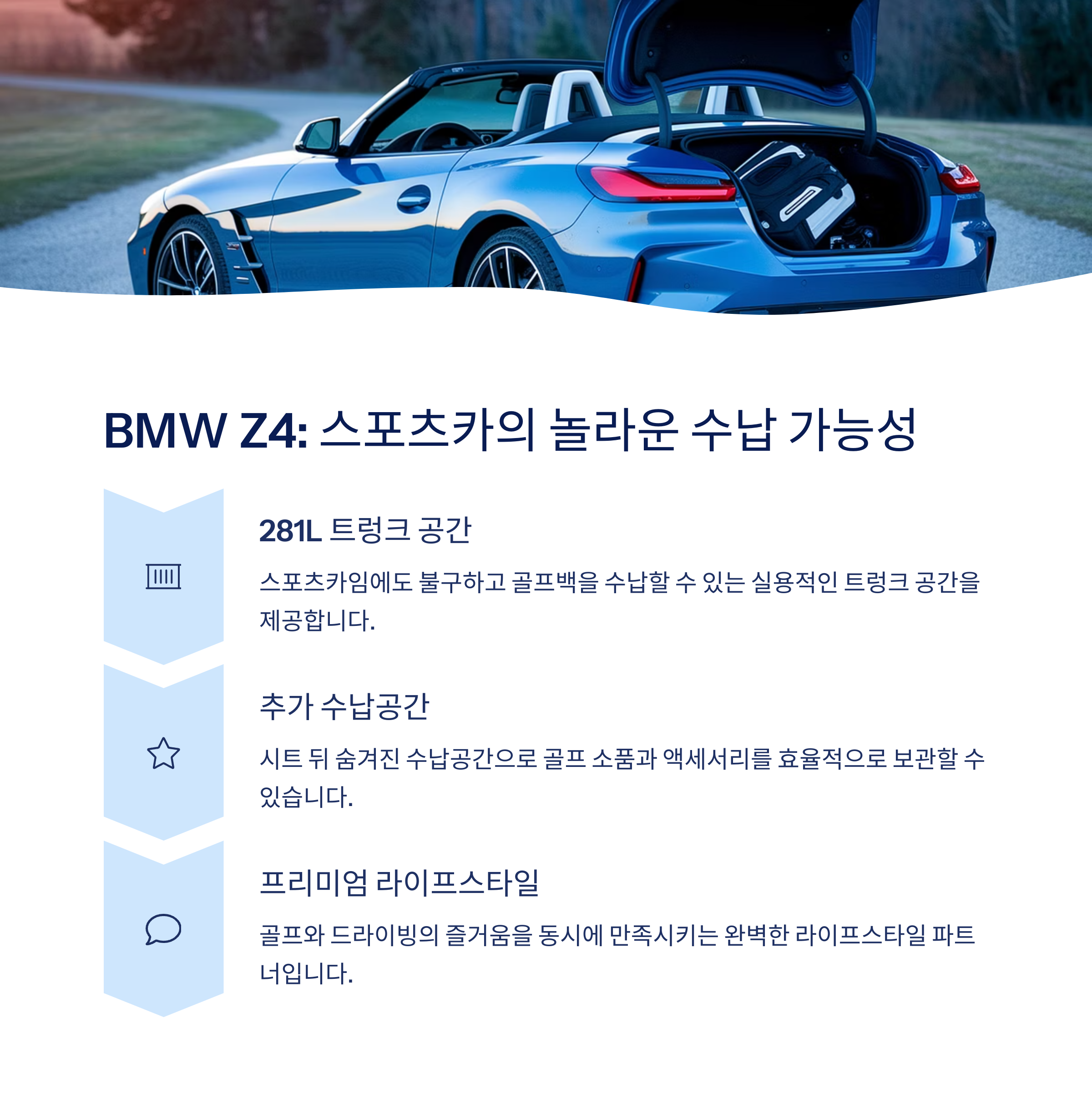 BMW Z4는 로드스터임에도 불구하고 뛰어난 트렁크 공간을 제공합니다. 기본 트렁크 용량이 281L로, 골프백 1개와 소형 가방을 적재하는 데 적합합니다. 추가로 시트 뒤의 수납공간을 활용하면 더 많은 물품을 수납할 수 있습니다. 소형 스포츠카이지만 공간 효율성이 돋보이며, 골프를 즐기는 1~2인 사용자에게 최적입니다. 단, 여러 개의 골프 장비를 적재하려면 X1 또는 X3 같은 SUV 모델이 더 적합합니다. |