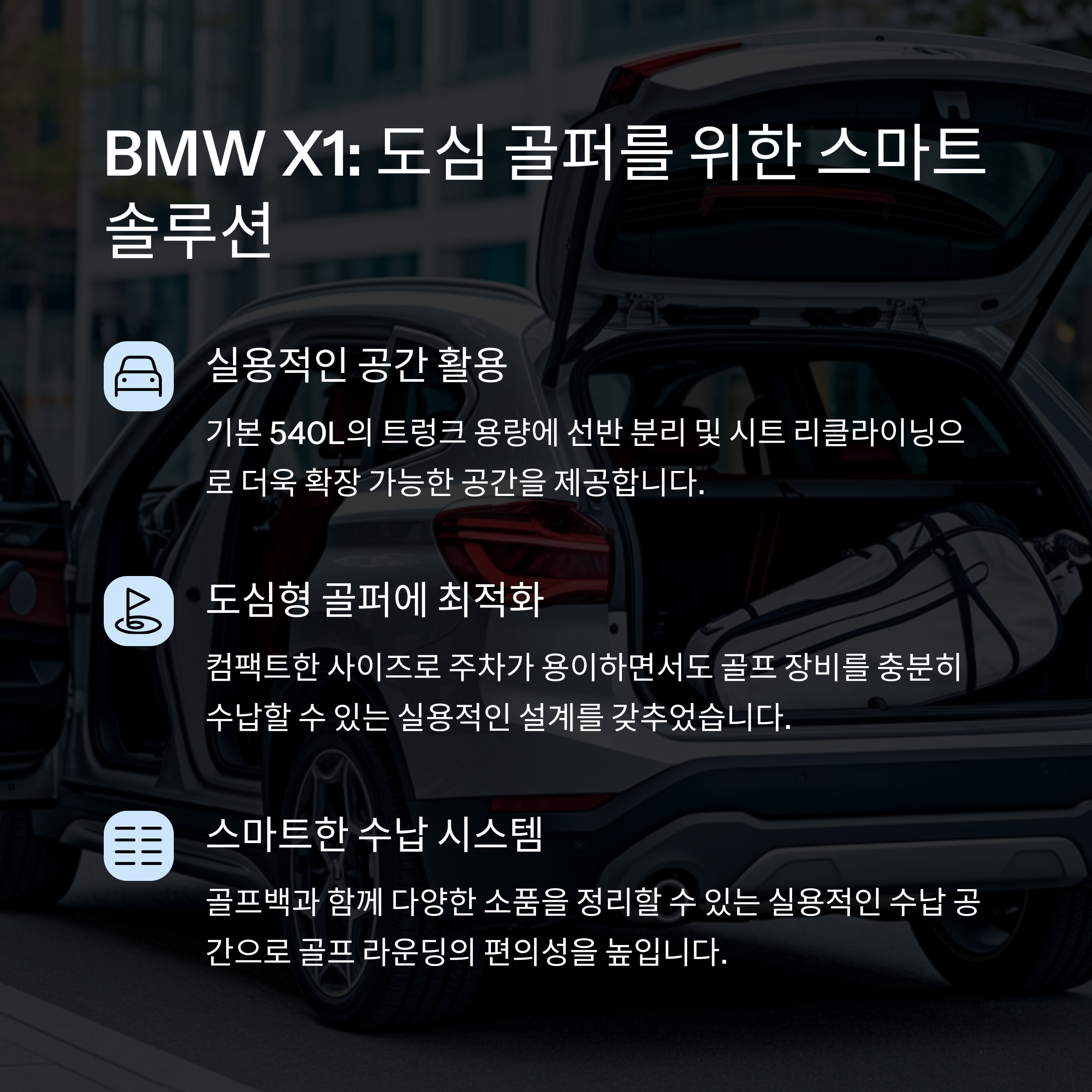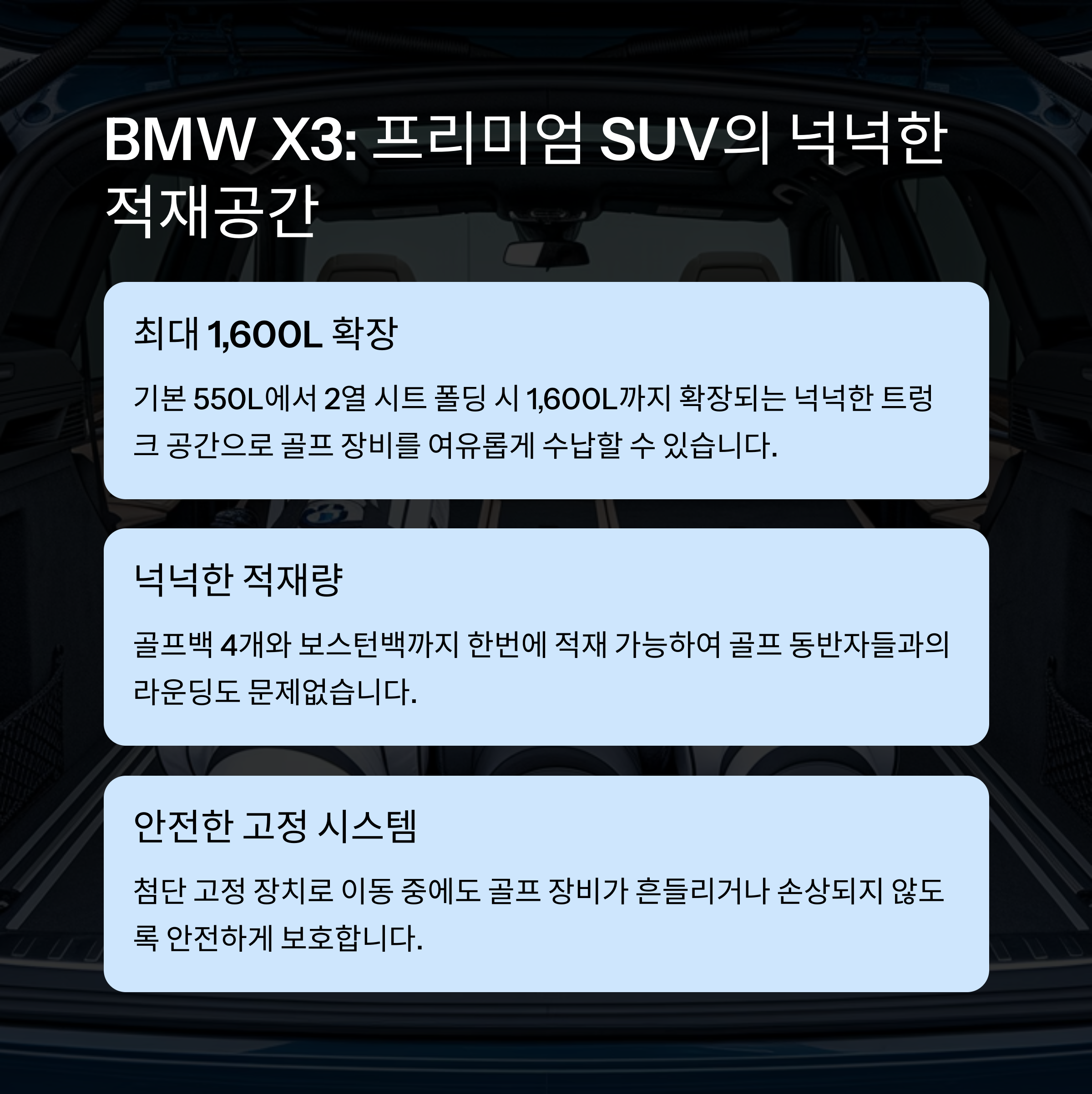 | BMW X3 | 550L | 1600L | 폴딩 시 골프백 4개 수납 가능 |
