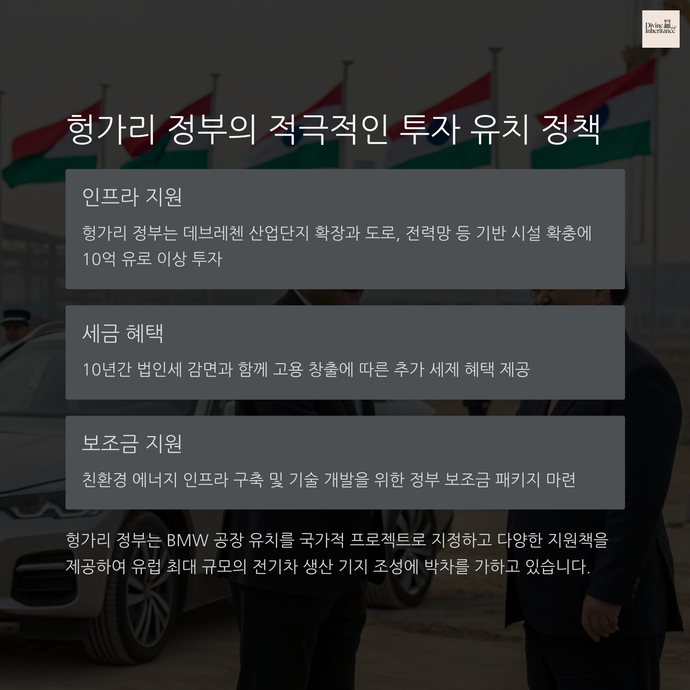 예를 들어, BMW는 데브레첸(Debrecen)에 위치한 400헥타르 규모의 부지를 무상 혹은 매우 저렴한 가격에 확보했으며, 헝가리 정부는 전력망, 도로, 철도 등 관련 인프라 구축에도 적극 나섰다. 이와 같은 조건은 다른 국가와 비교했을 때 월등히 매력적인 제안이었고, BMW가 헝가리를 선택하게 된 직접적인 이유 중 하나로 꼽힌다.