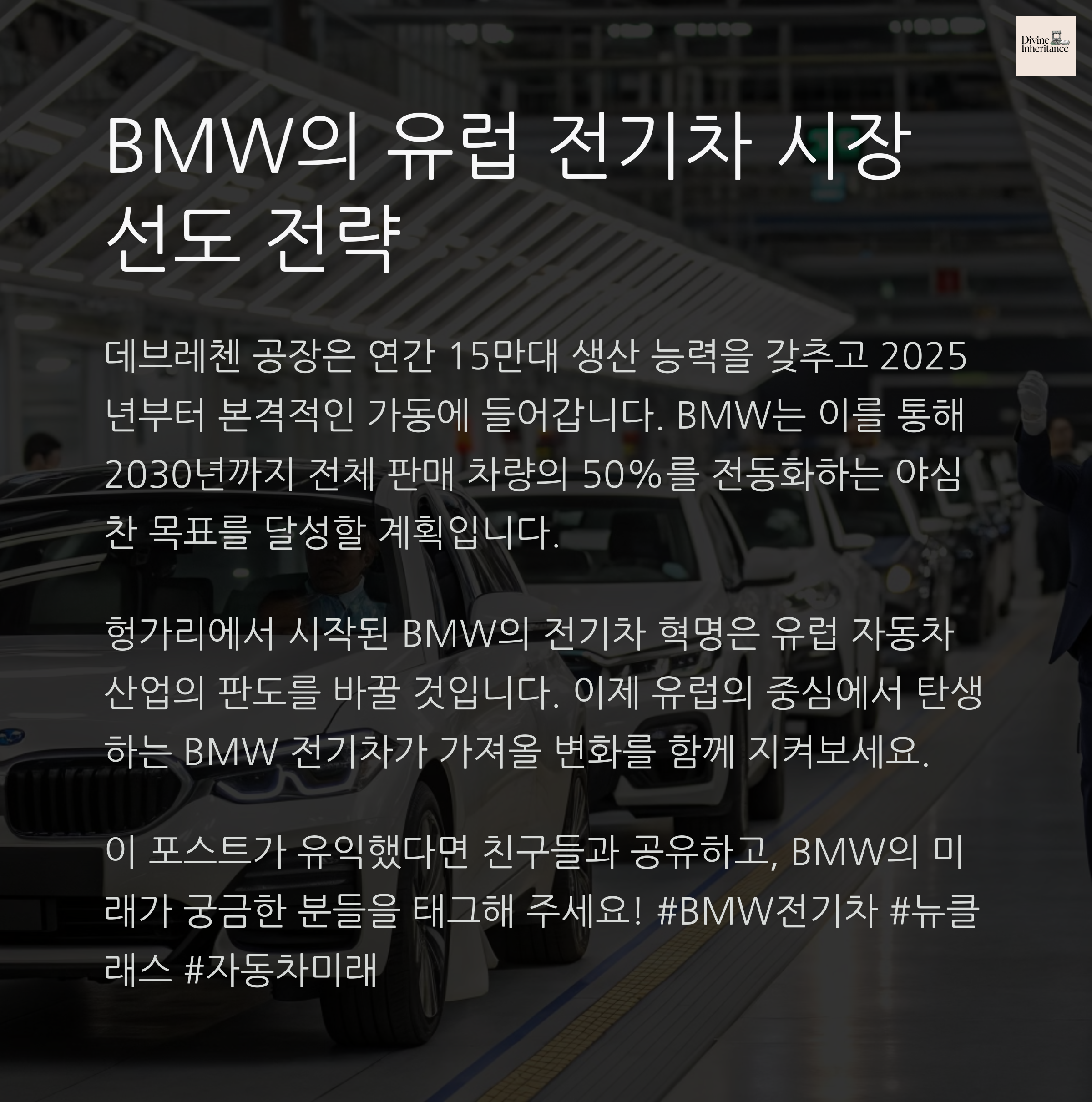 전기차 산업이 앞으로 더 커질수록, BMW와 헝가리 공장의 조합은 더 많은 기업들에게 새로운 방향을 제시하는 벤치마크가 될 것이다. BMW 헝가리 전기차 공장은 단순히 '이유가 있는 선택'이 아닌, 미래를 내다본 전략적 승부수임이 틀림없다.
