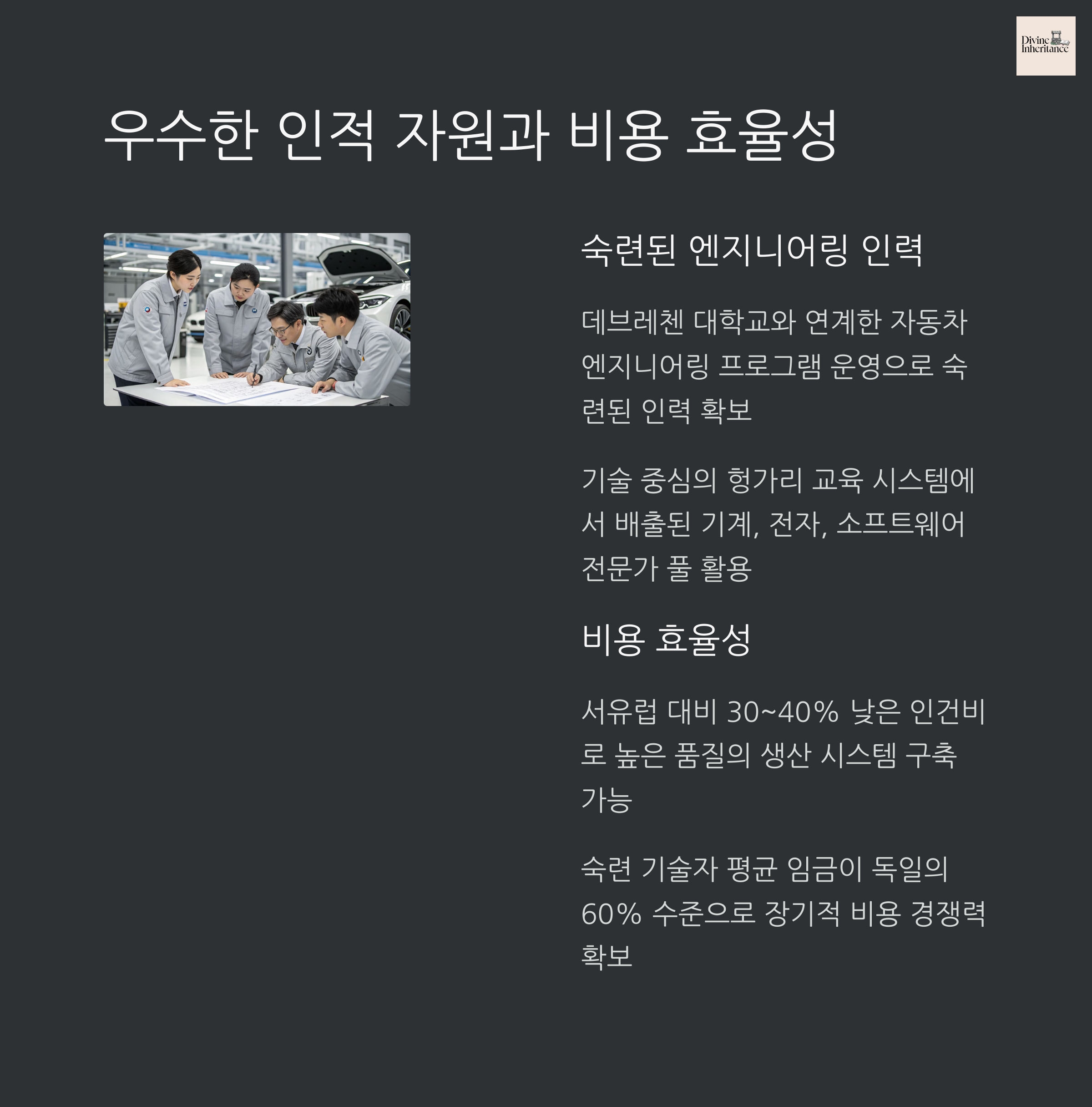 헝가리는 오랜 시간 유럽 내 제조업 중심지 역할을 해왔다. 특히 기계공학, 전기전자, IT 분야에서 탄탄한 교육 시스템을 갖추고 있으며, 숙련된 노동력이 풍부하다. 이는 BMW가 고도화된 생산시설을 운영하는 데 있어 결정적인 장점으로 작용한다.