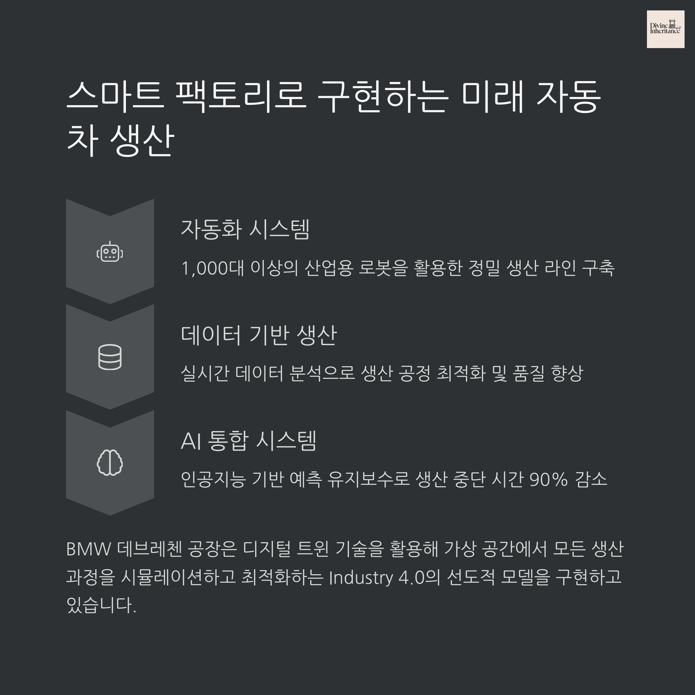BMW 헝가리 공장은 단순한 생산라인이 아닌, 최첨단 기술이 적용된 스마트 팩토리다. 이는 BMW가 'iFACTORY'라는 이름으로 추진 중인 디지털 전환 전략의 일환이다. 헝가리 공장은 완전 자동화된 로봇 시스템, 클라우드 기반 생산관리, AI 기반 품질 관리 시스템 등 혁신 기술이 집약되어 있는 시설이다.