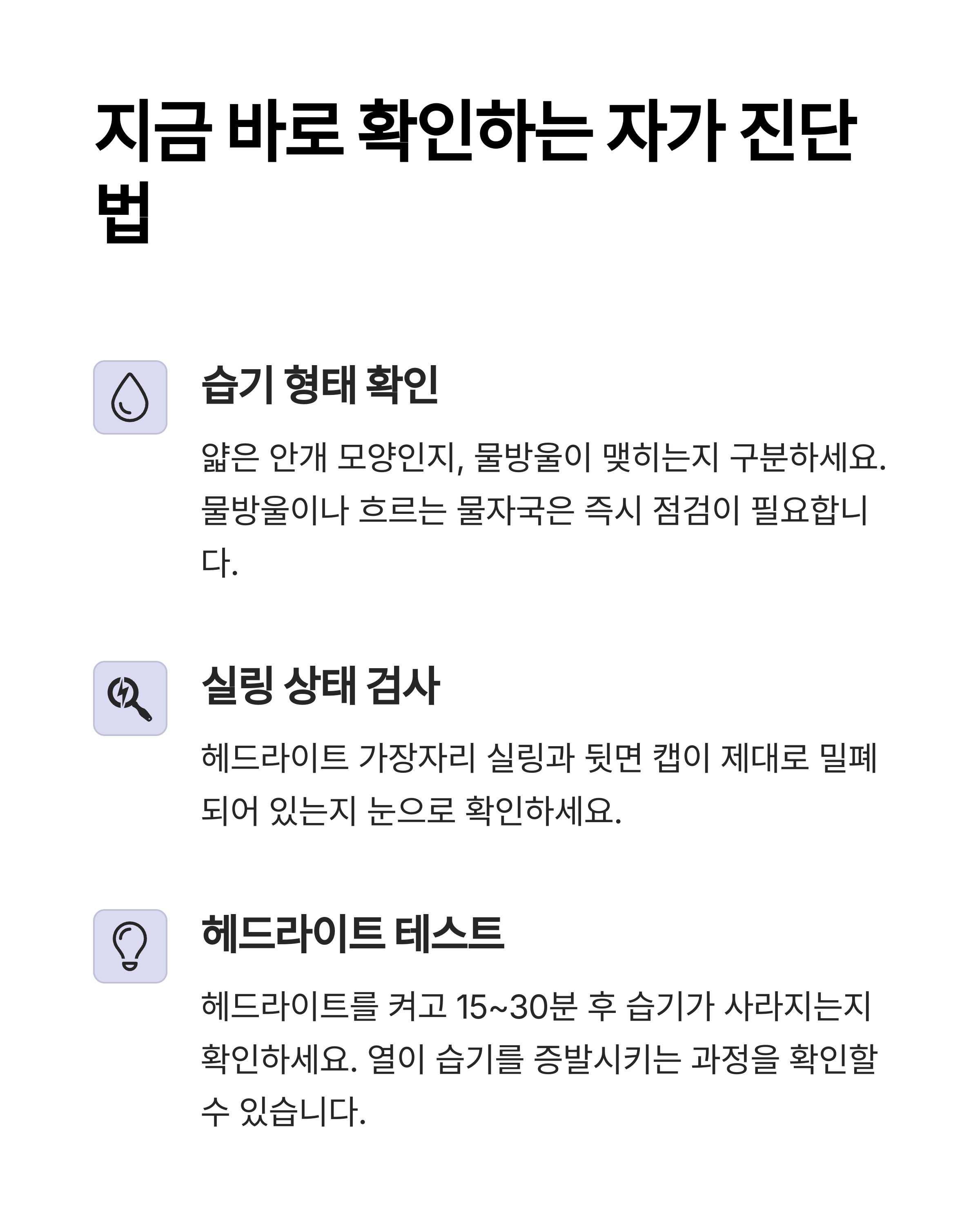 대부분의 정상 습기는 2~4시간 내 자연 제거됩니다. - 헤드라이트 외부 크랙 유무 확인
