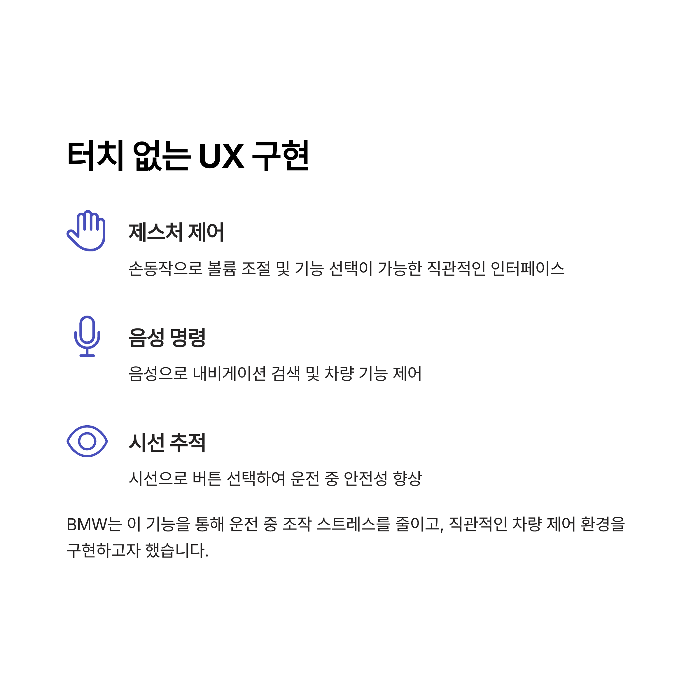 BMW는 이 기능을 통해 운전 중 조작 스트레스를 줄이고, 직관적인 차량 제어 환경을 구현하고자 했습니다.