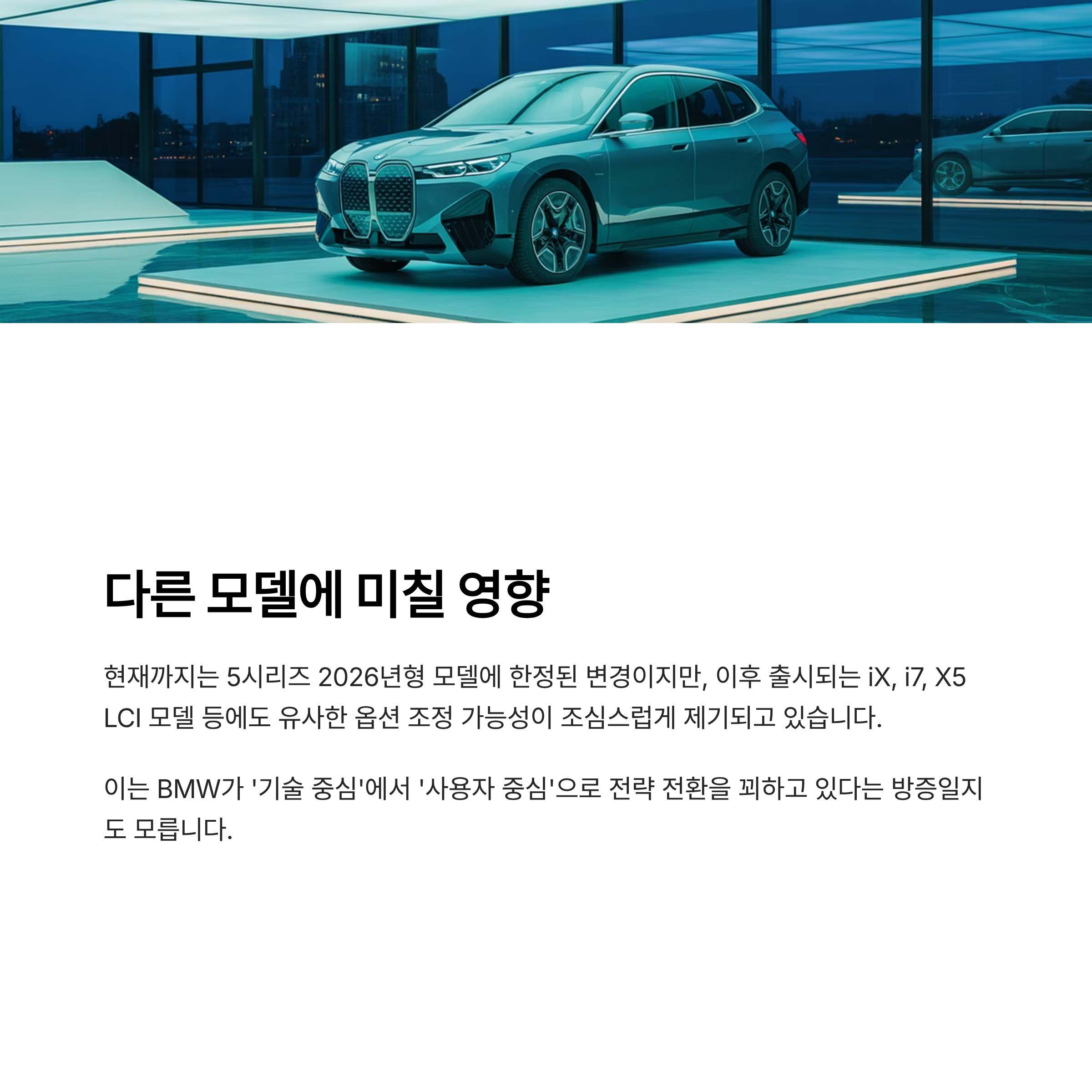 이후 출시되는 iX, i7, X5 LCI 모델 등에도 유사한 옵션 조정 가능성이 조심스럽게 제기되고 있습니다.