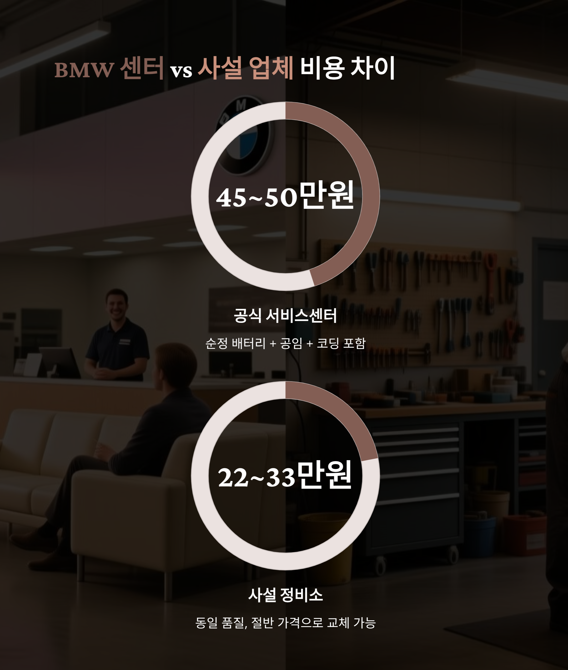 BMW 공식 서비스센터에서 배터리 교체 시 공임 포함 평균 45만원 이상, 바르타 배터리 기준 사설 업체에서는 약 25~33만원 수준으로 절반 가까이 차이가 날 수 있습니다.