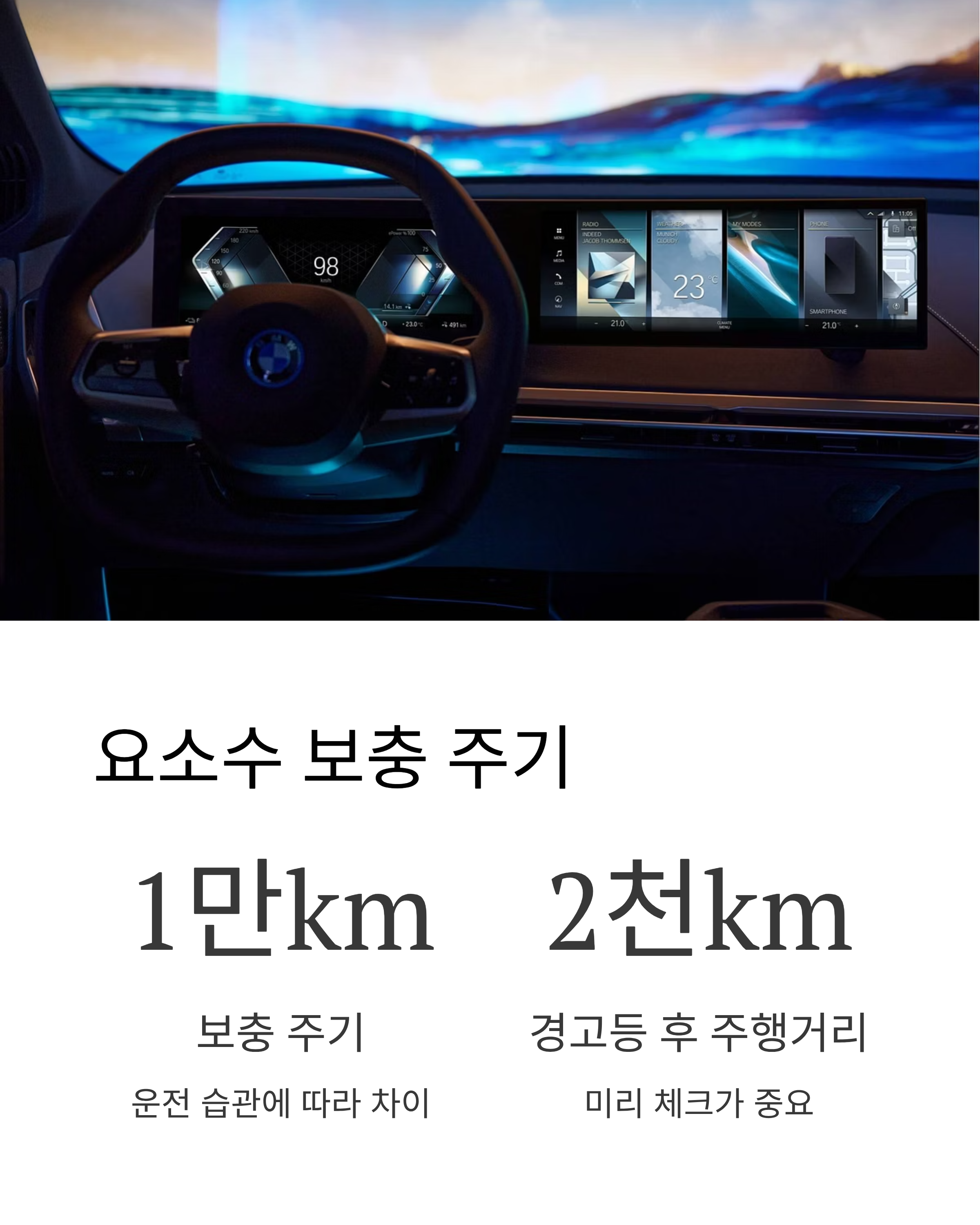 요소수가 부족하면 계기판에 경고등이 뜨는데, 이때 남은 주행거리는 약 2,000km 정도예요.