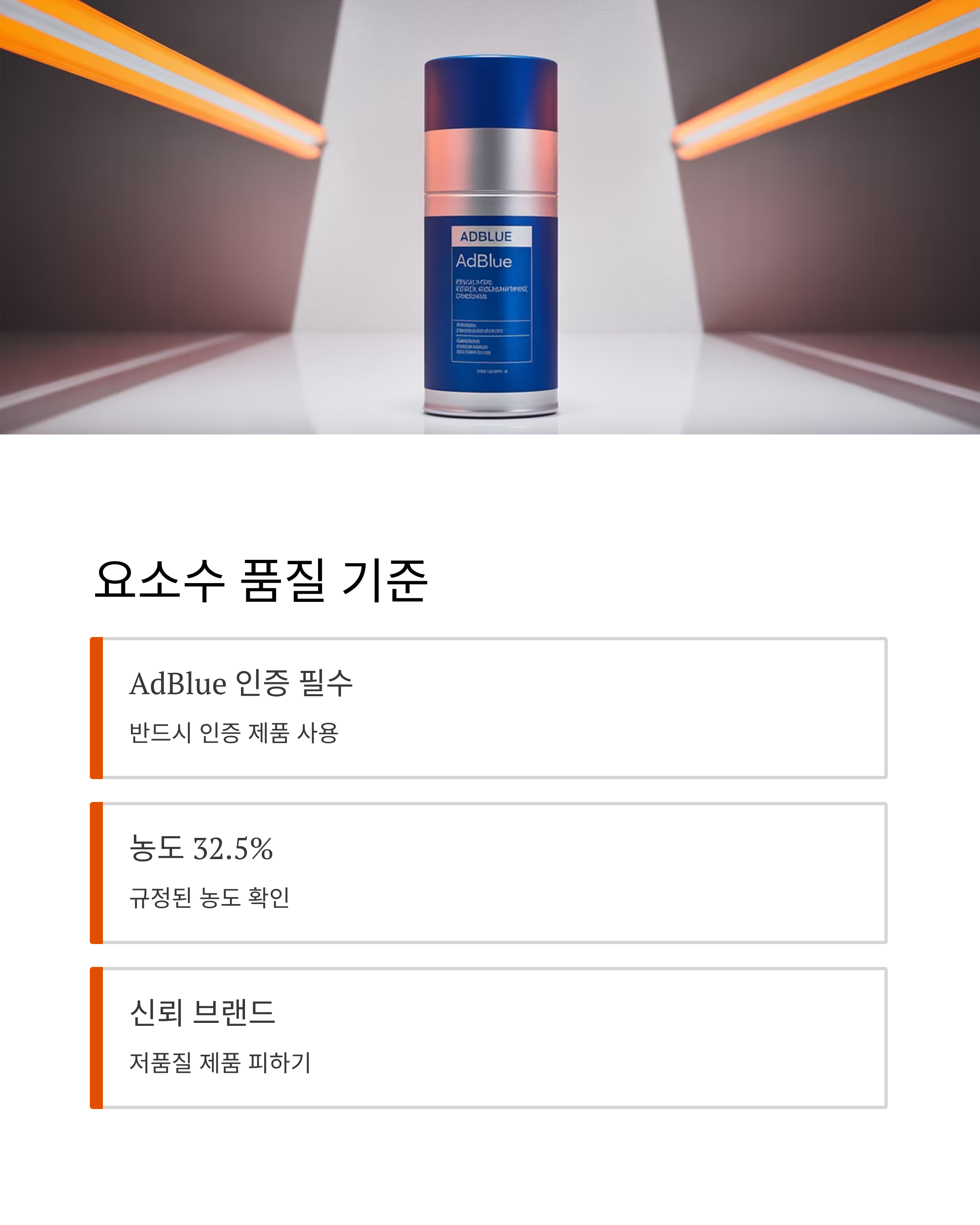 저품질 요소수를 넣으면 차량 시스템에 문제가 생길 수 있으니, 꼭 신뢰할 수 있는 제품을 선택하세요.
