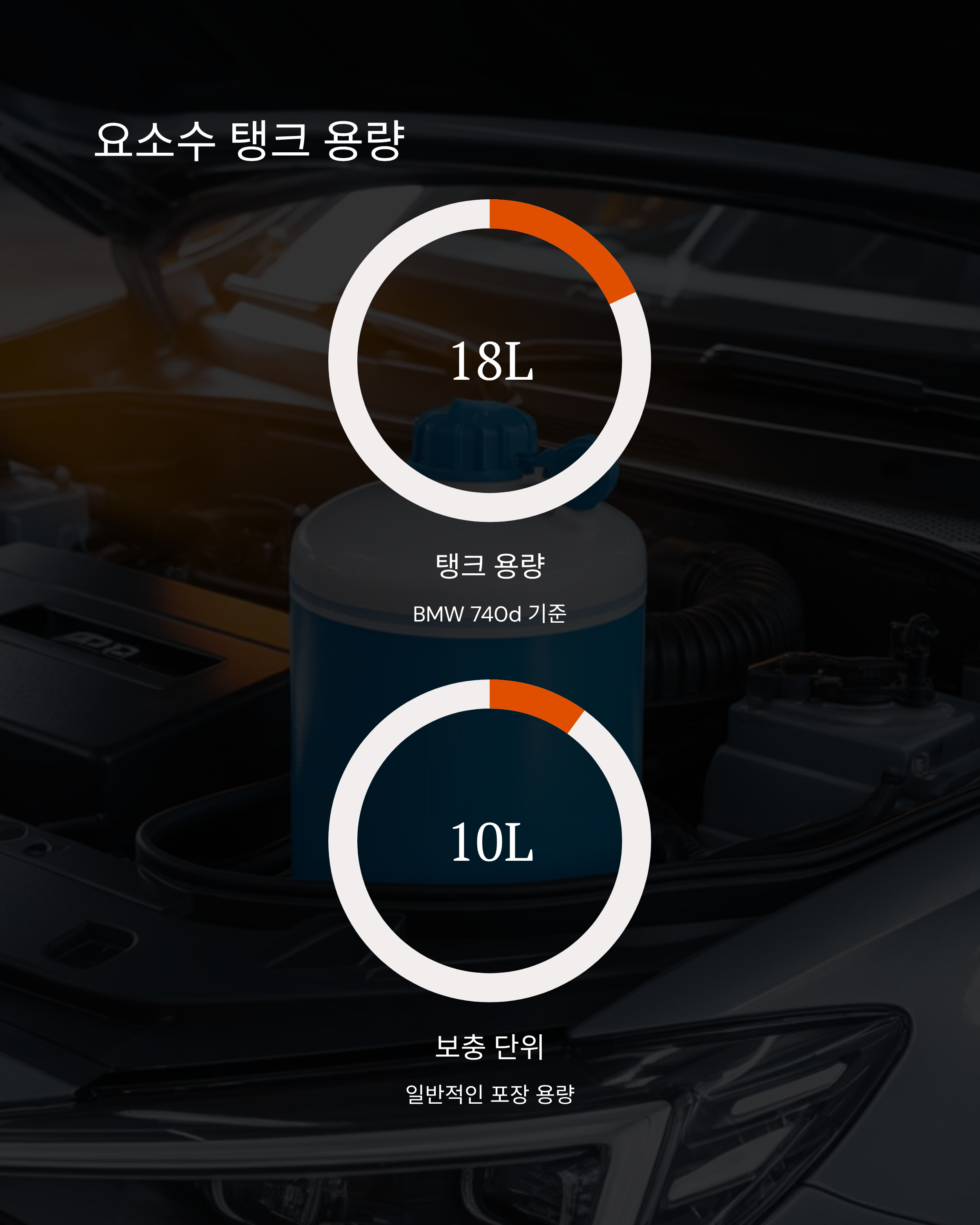 BMW 740d는 약 18~20리터의 요소수 탱크를 가지고 있어요.