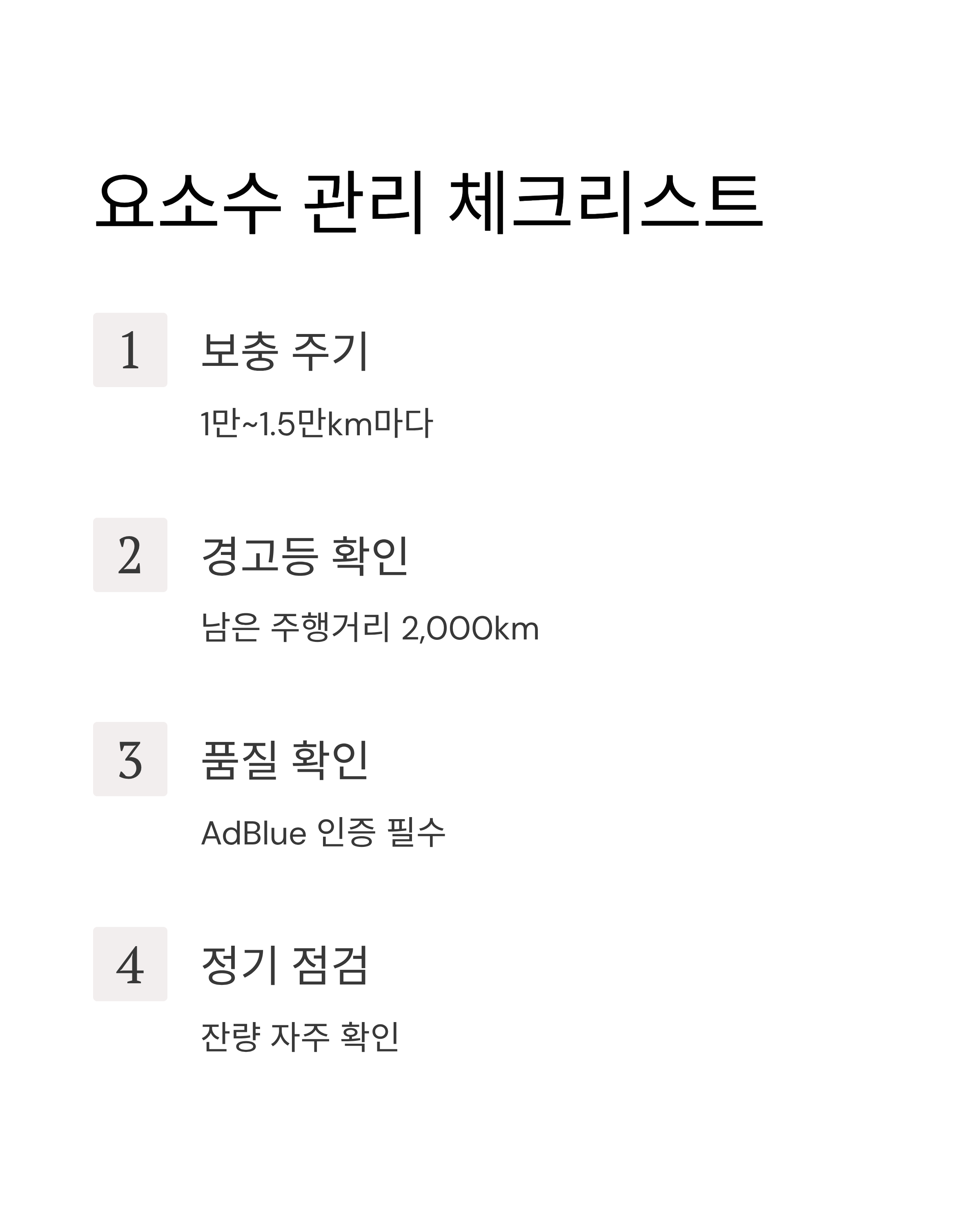 - 자주 운전한다면, 차량 내 요소수 잔량 자주 확인