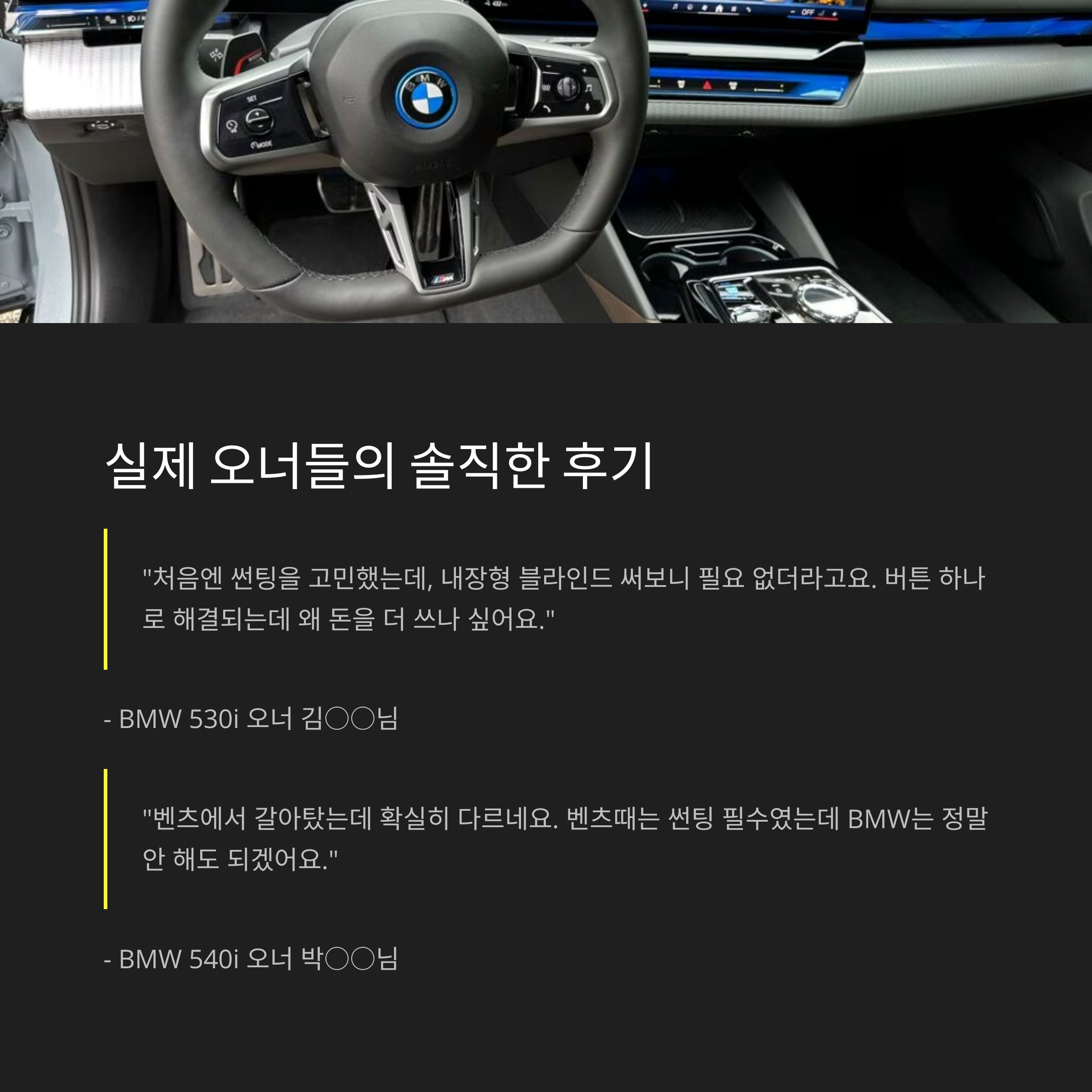 "벤츠에서 갈아탔는데 확실히 다르네요. 벤츠때는 썬팅 필수였는데 BMW는 정말 안 해도 되겠어요."