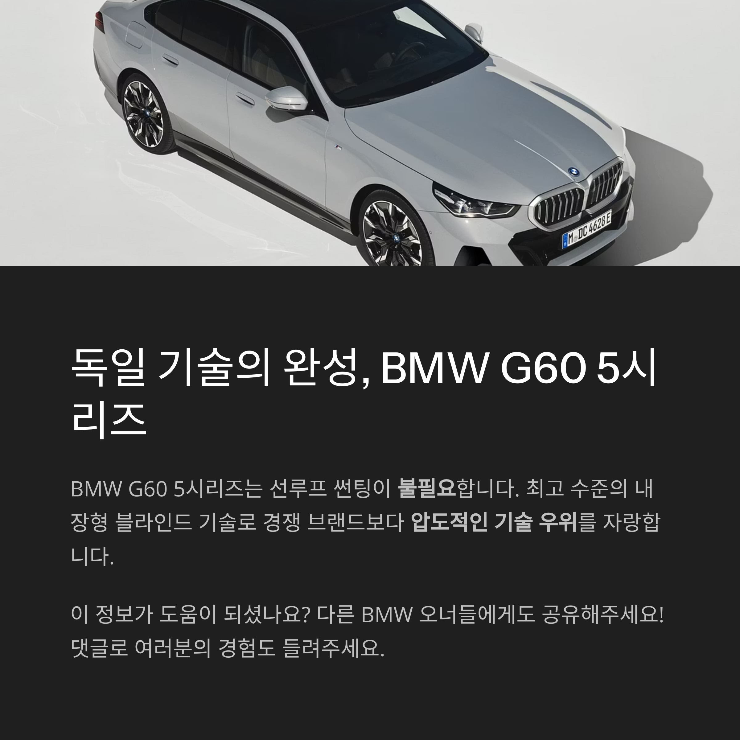 BMW G60 5시리즈의 선루프는 썬팅이 필요 없습니다. 이는 단순한 의견이 아닌, 독일 프리미엄 기술력의 결과입니다. 오늘 이 글로 끝없는 논란에 마침표를 찍어보겠습니다.