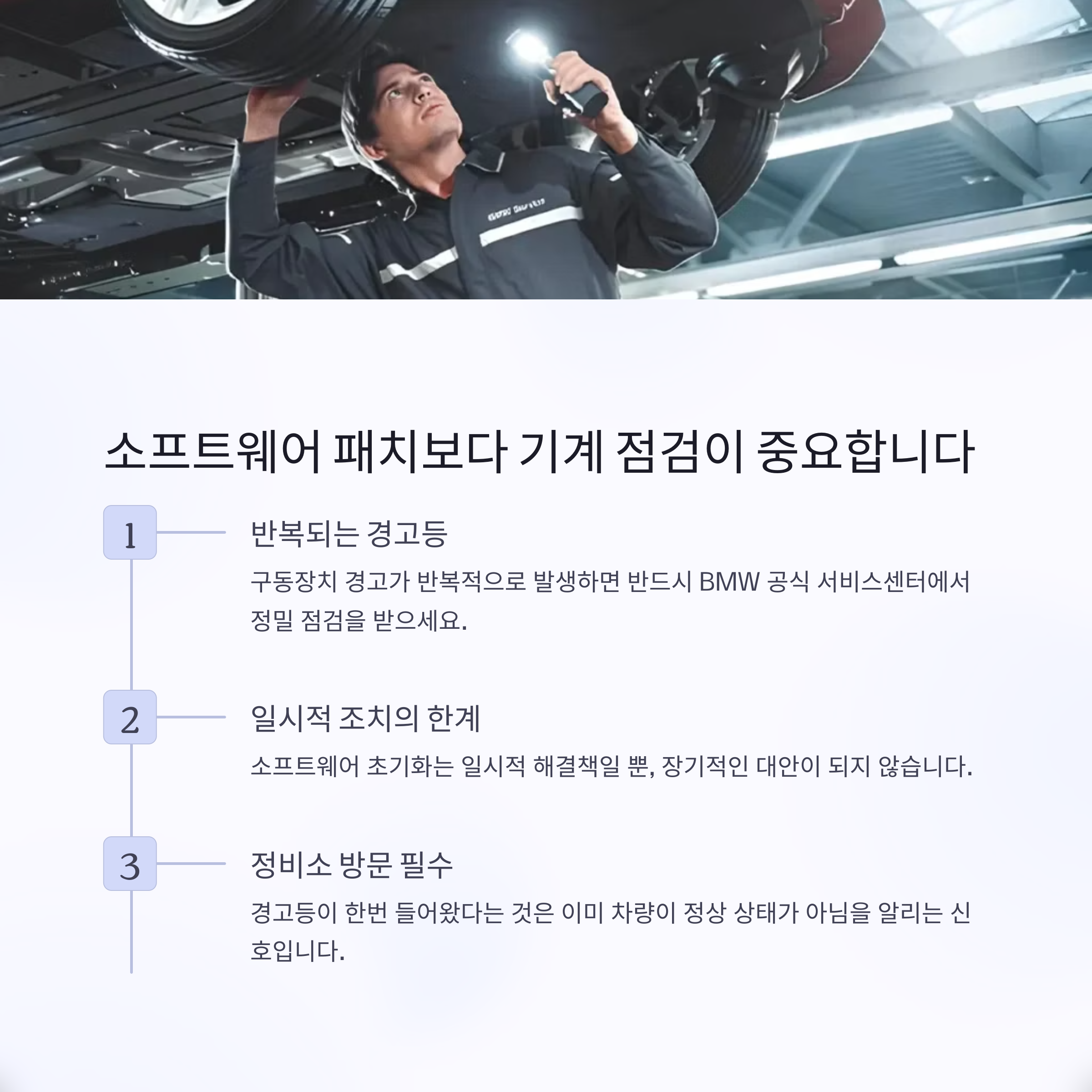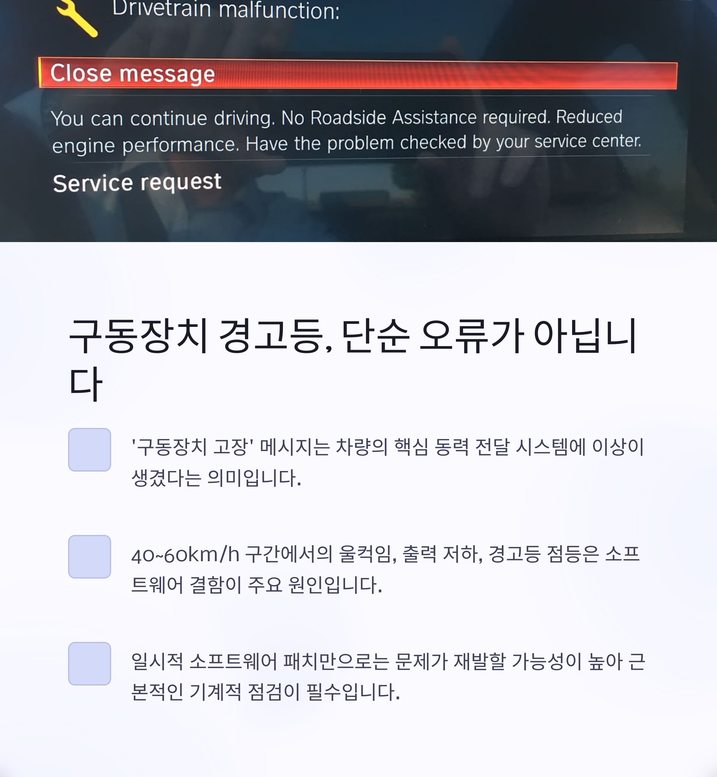 반복적으로 동일한 구동장치 경고가 뜨는 경우, 반드시 BMW