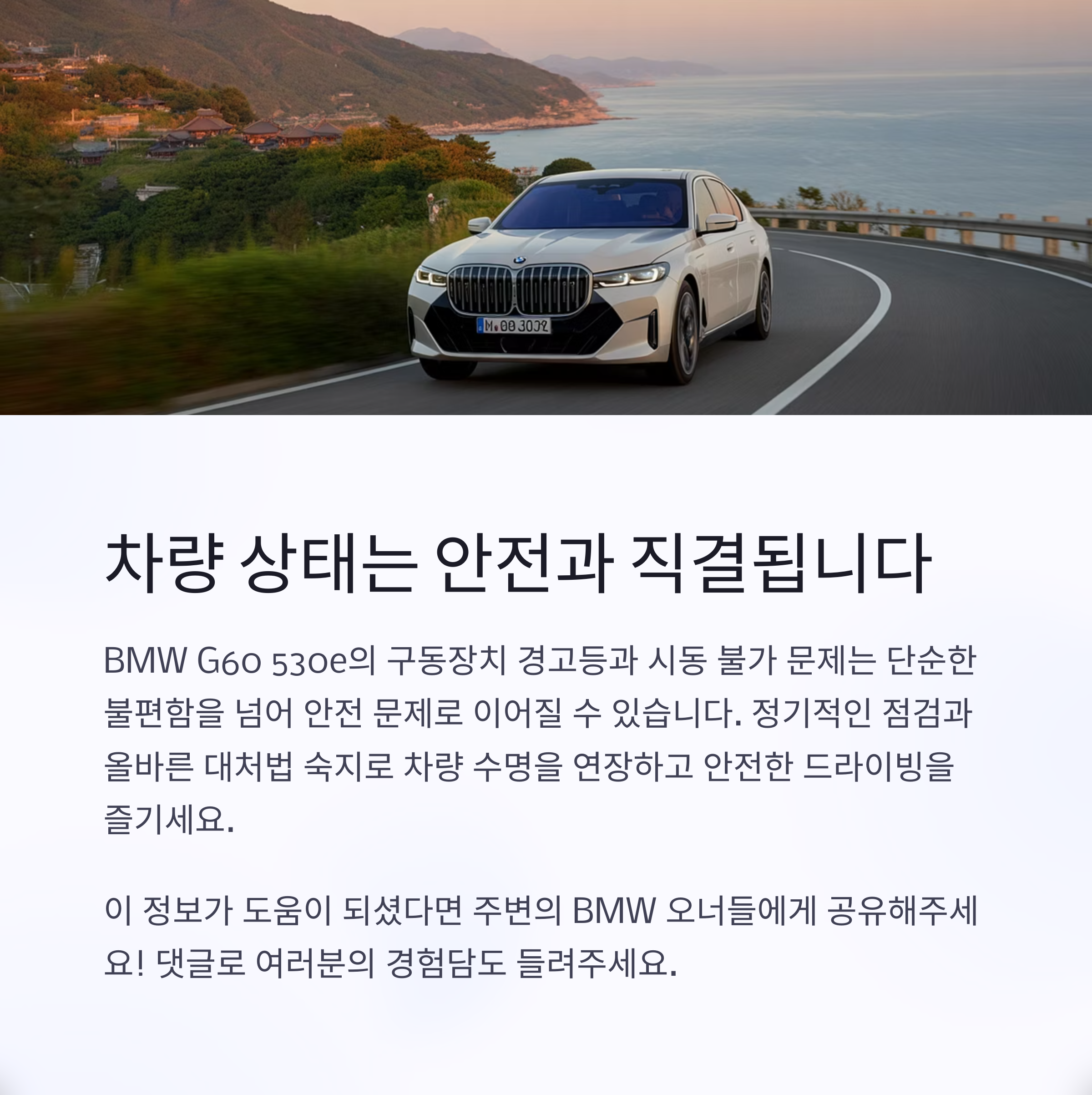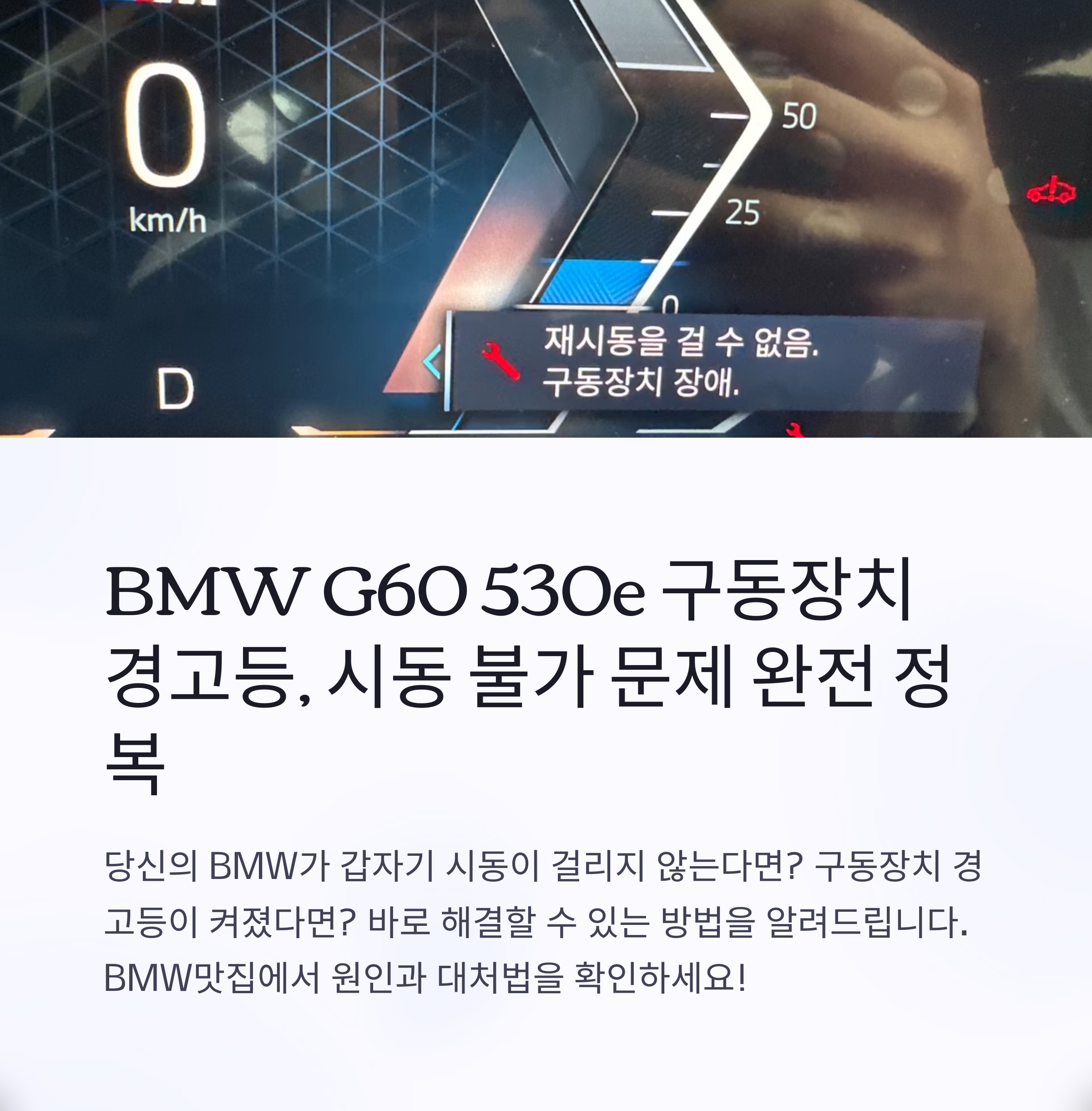 BMW G60 530e 차량에서 자주 발생하는 구동장치 장애 및 시동 불가 경고등은 단순한 오류 표시가 아닌 차량의 핵심 시스템 이상을 의미합니다. 이 글에서는 실제 사례와 함께 주요 원인, 증상, 대처법까지 총정리하여 알려드립니다.