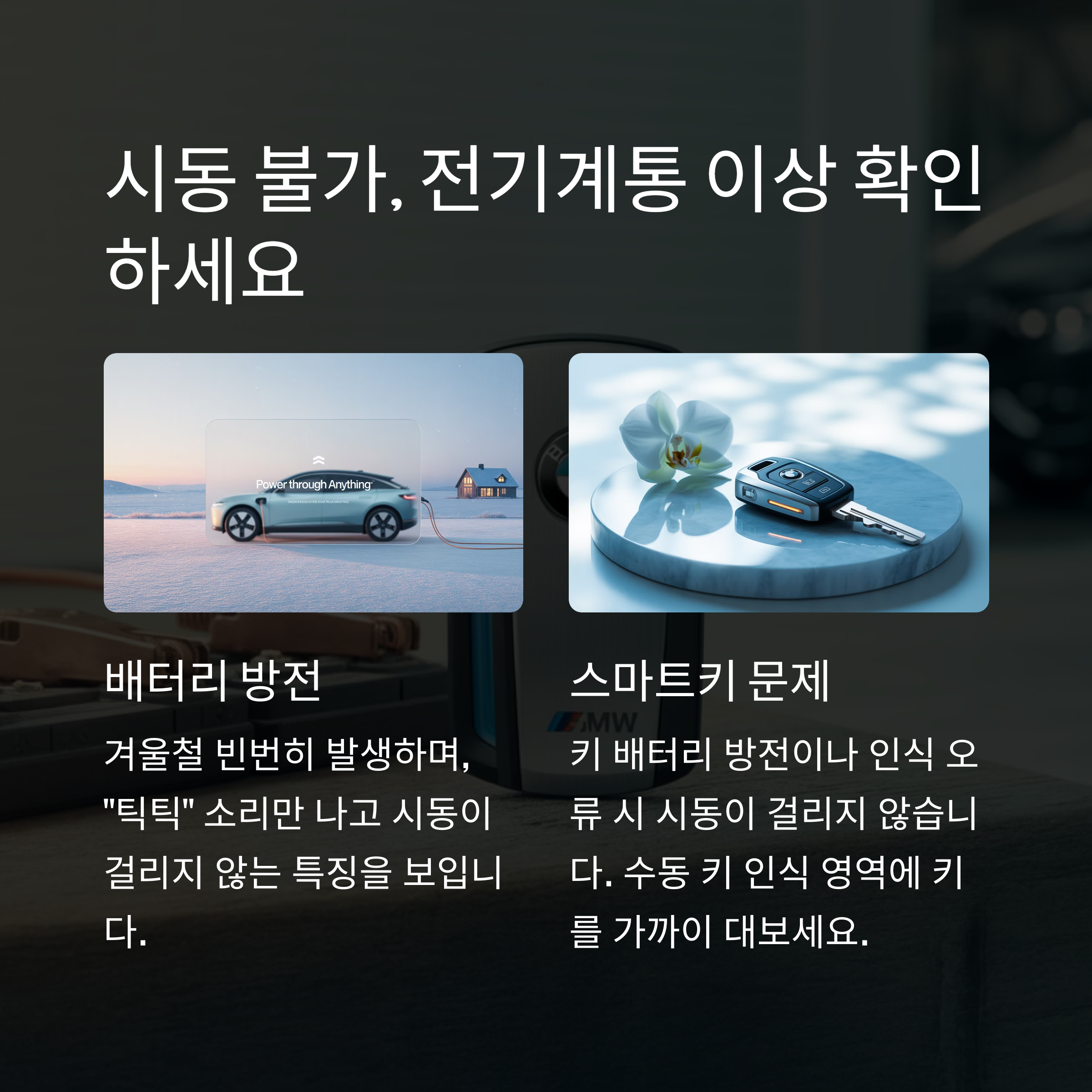 | 시동 안 됨 | 배터리 점프 또는 스마트키 인식 확인 | 배터리·스타트 모터 점검 |