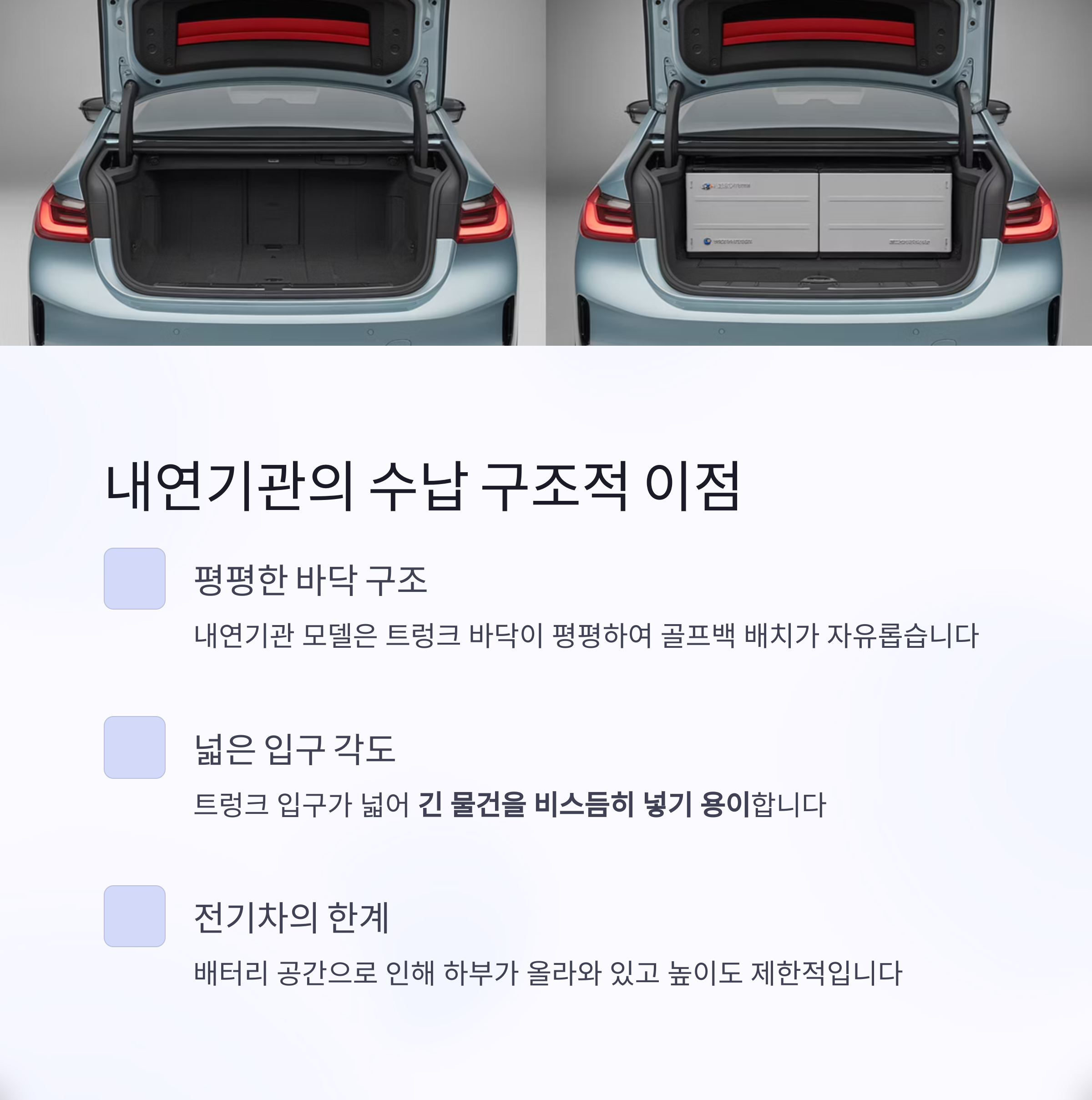 | 트렁크 입구 각도 | 좁고 경사 있음 | 넓고 수평에 가까움 |