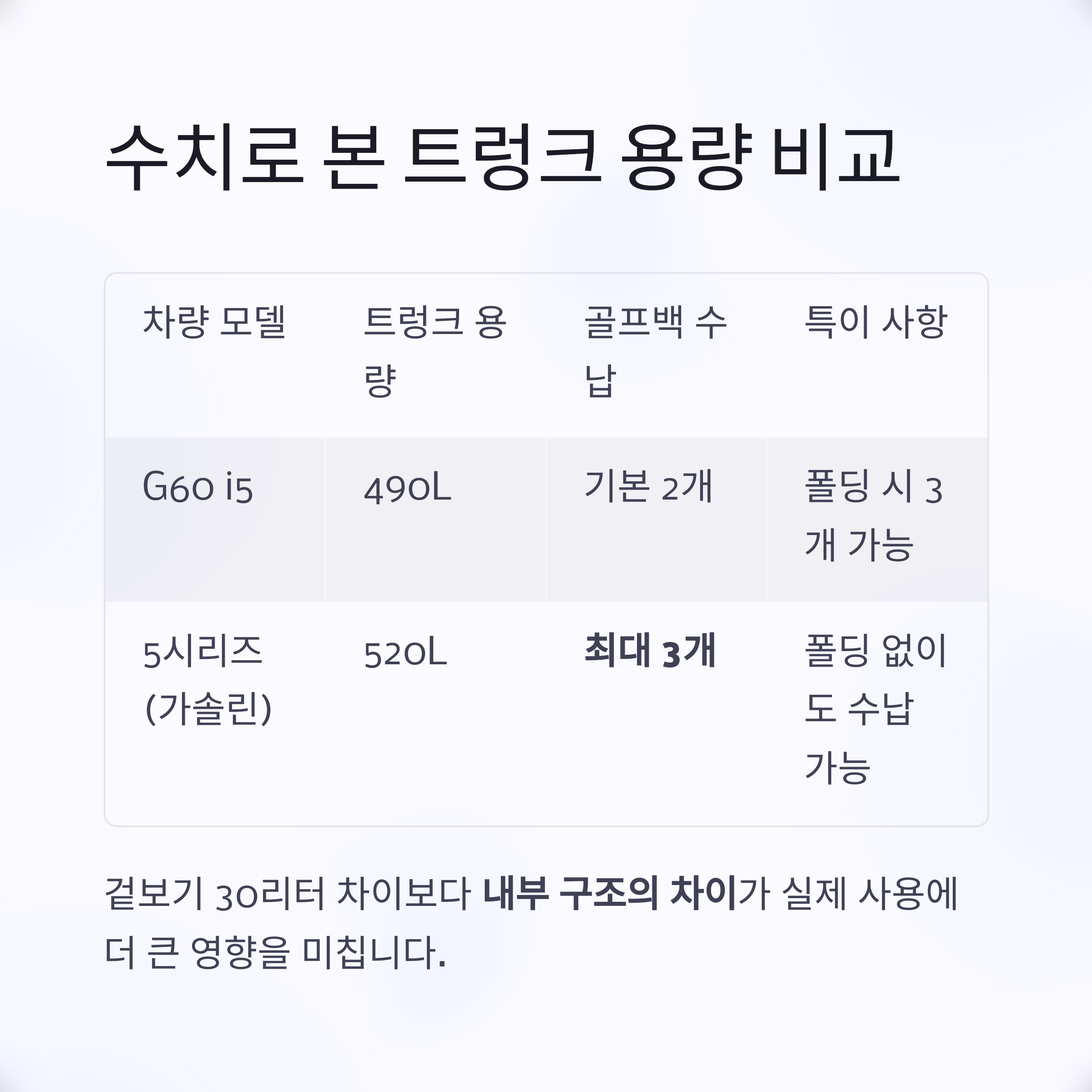 | 차량 모델 | 트렁크 용량 | 골프백 수납 가능 수 | 특이 사항 |