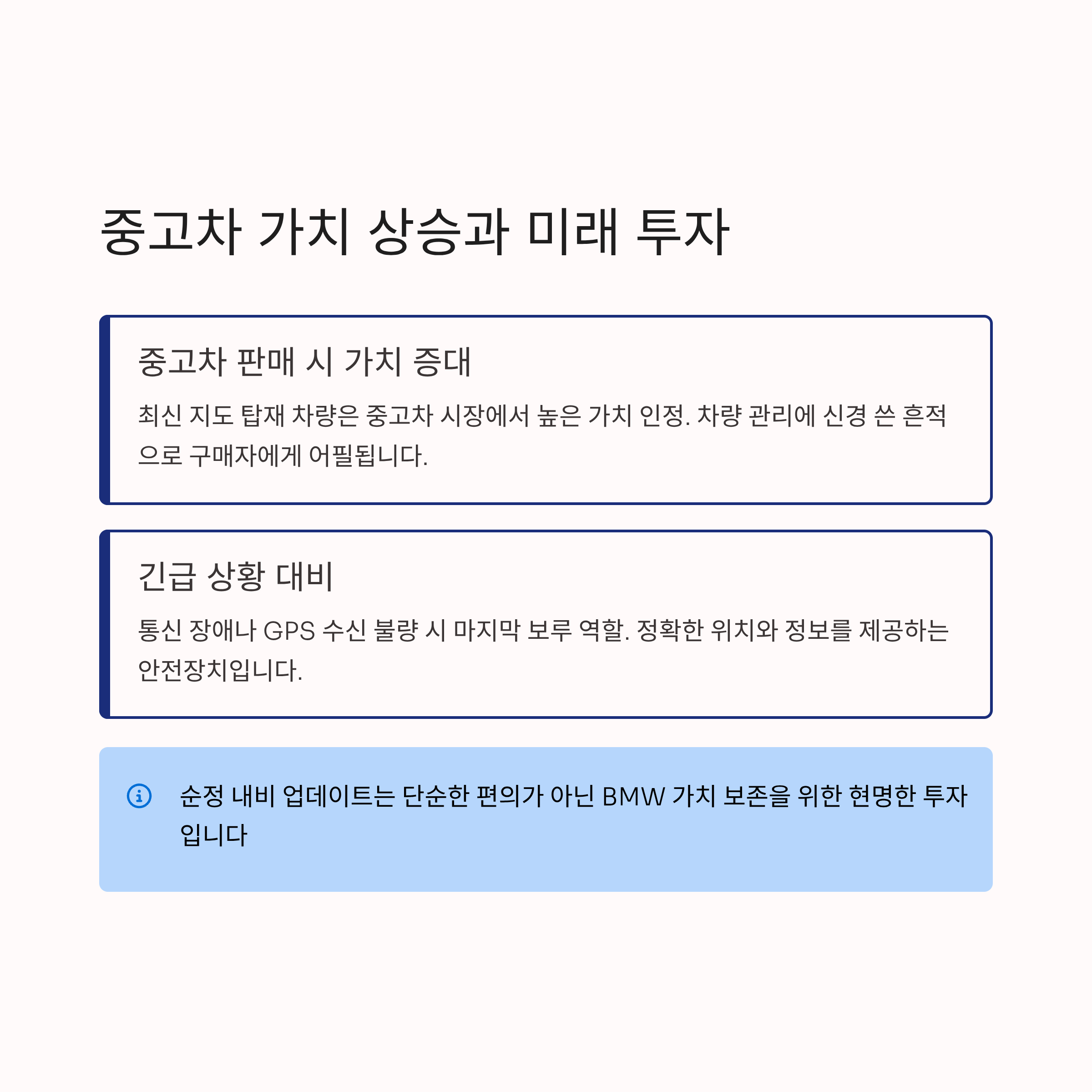 BMW 순정 내비 업데이트는 단순한 편의 기능을 넘어, 차량의 가치를 유지하고 향후 발생할 수 있는 문제에 대비하는 '투자'입니다.