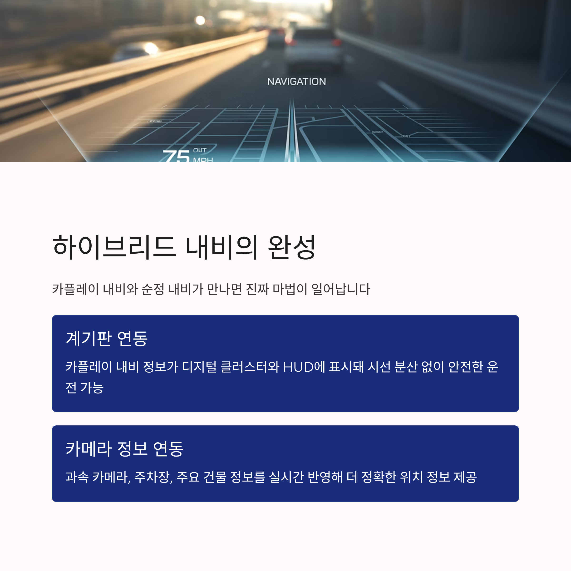 많은 분들이 카플레이 내비(티맵, 카카오내비, 네이버 지도 등)를 선호하는 이유는 실시간 교통 정보를 반영한 최적의 경로 안내 때문입니다. 하지만 순정 내비게이션 업데이트는 이 카플레이 내비의 기능을 더욱 풍부하게 만들어줍니다. 바로 '하이브리드 내비' 기능 덕분입니다.