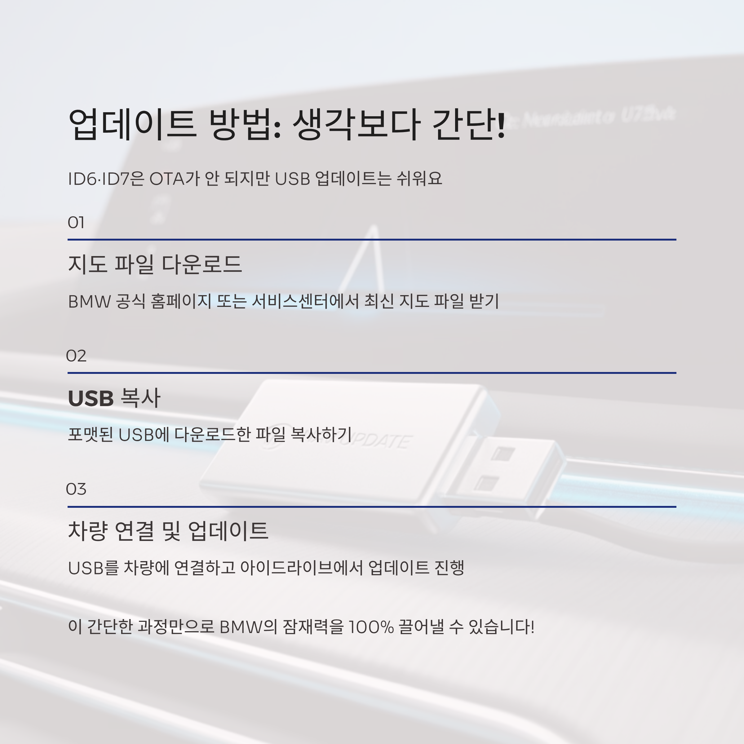 - 차량의 USB 포트에 연결하고, 아이드라이브(iDrive) 시스템에서 업데이트를 진행합니다.