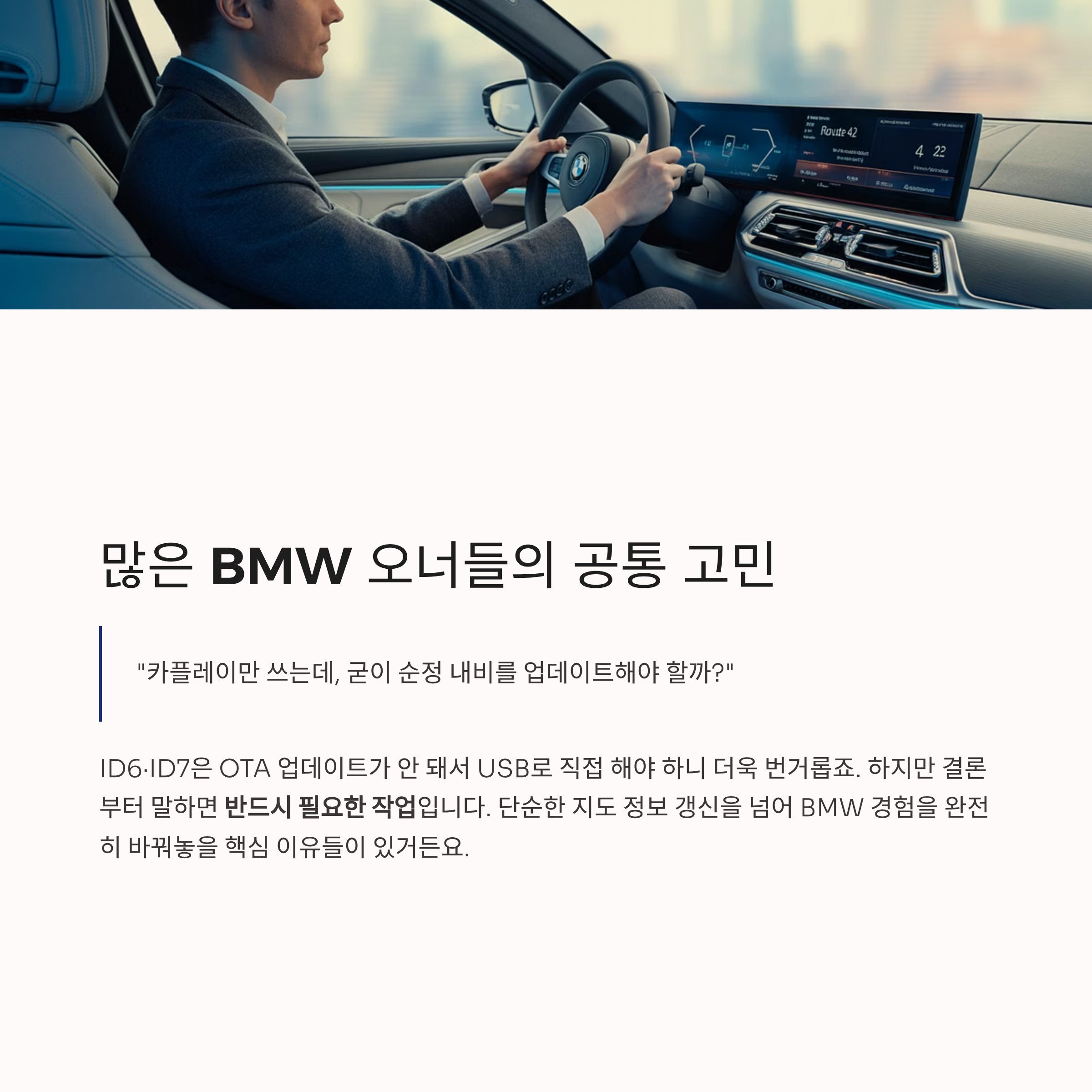 BMW 오너라면 한 번쯤 고민해 보셨을 겁니다. "카플레이만 쓰는데, 굳이 순정 내비게이션을 업데이트해야 할까?" 특히 ID6와 ID7 시스템은 OTA(Over-The-Air) 업데이트가 지원되지 않고, 직접 USB를 이용하여 업데이트해야 하므로 그 번거로움 때문에 더더욱 망설이게 됩니다. 하지만 결론부터 말씀드리면, 카플레이를 주로 사용하더라도 BMW ID6 및 ID7 순정 내비 업데이트는 반드시 필요한 작업입니다. 단순한 지도 정보 갱신을 넘어, 여러분의 BMW 라이프를 한층 더 업그레이드해 줄 핵심적인 이유들을 지금부터 자세히 알려드립니다.