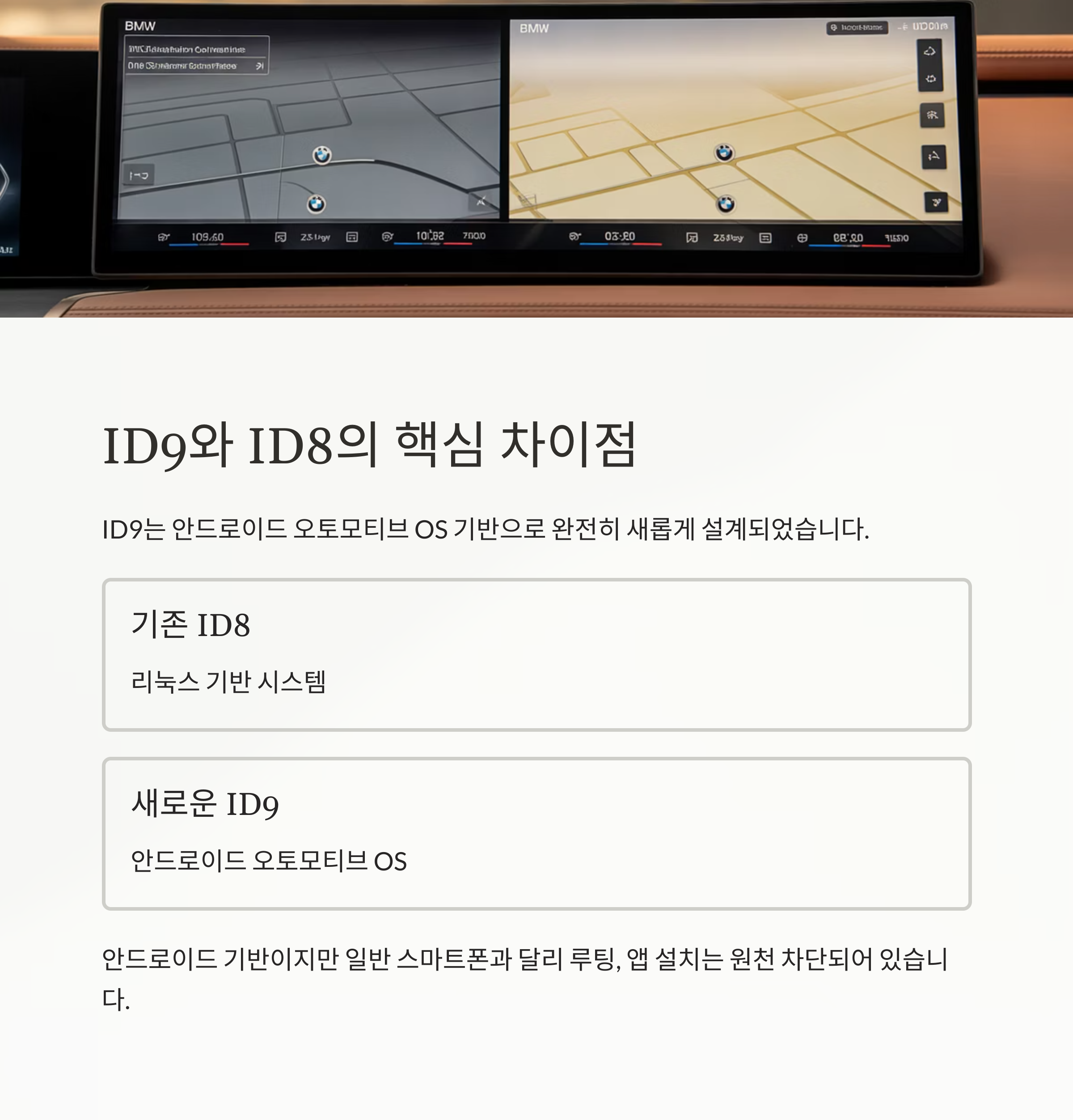 ID9는 기존 리눅스 기반에서 안드로이드 오토모티브로 완전히 전환되었습니다.